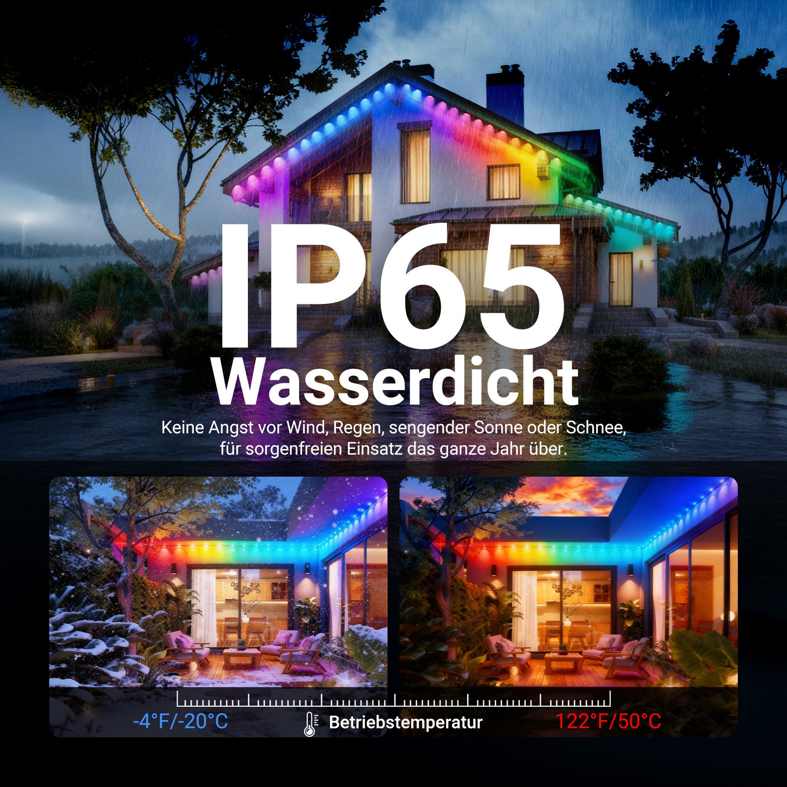 • IP65 wasserdicht für sichere Außenbeleuchtung- Die NR02 Permanent Lichterkette für den Außenbereich für Haus Garten Camping Wohnmobil oder Markisen verfügt über ein professionelles IP65 wasserdichtes Design, gepaart mit einer IP65 zertifizierten Steuerbox und einem Netzteil, die eine stabile Funktion unter extremen Bedingungen von -20 °C bis 50 °C gewährleisten. Diese Lichter sind regen sonnen und schneebeständig und für den ganzjährigen Einsatz im Freien konzipiert. Sie erhellen Ihr Zuhause
