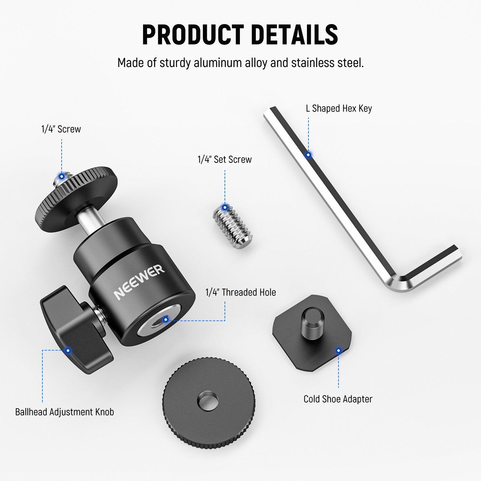 • 【Packungsinhalt】 Neewer Mini-Kugelkopf 2er-Pack, zwei Inbusschlüssel, zwei 1/4" Schrauben