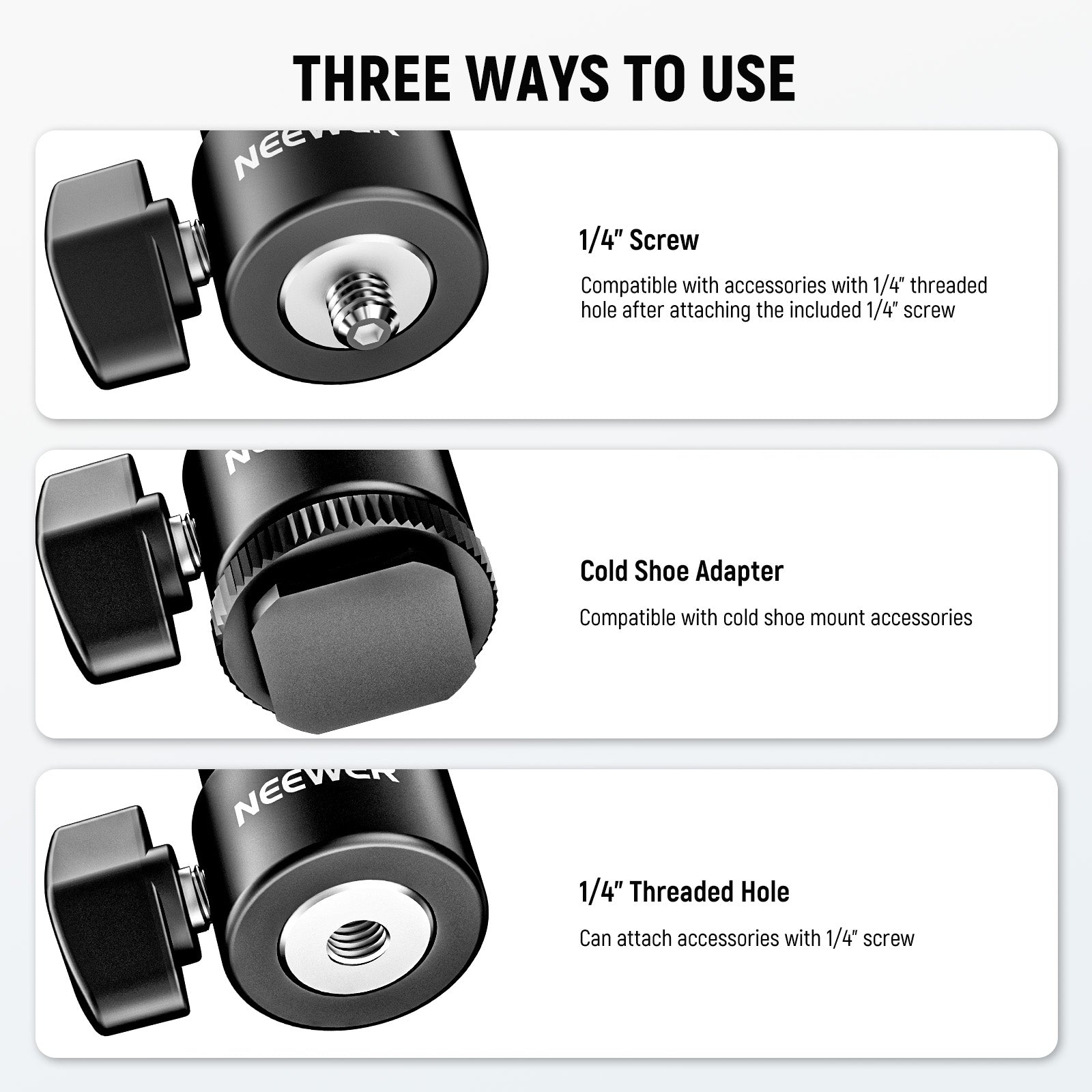 • 【Mini-Kugelkopf】 Befestigen Sie Ihre Kamera sicher über den Kaltschuhadapter. Mit der 1/4-Zoll-Schraube können Sie eine Vielzahl von Geräten montieren, z.B. LED-Fülllicht, LED-Blitz, Feldmonitor und anderes Zubehör mit einem 1/4-Zoll Gewindeloch. Der Einstellknopf verriegelt das Kugelgelenk fest