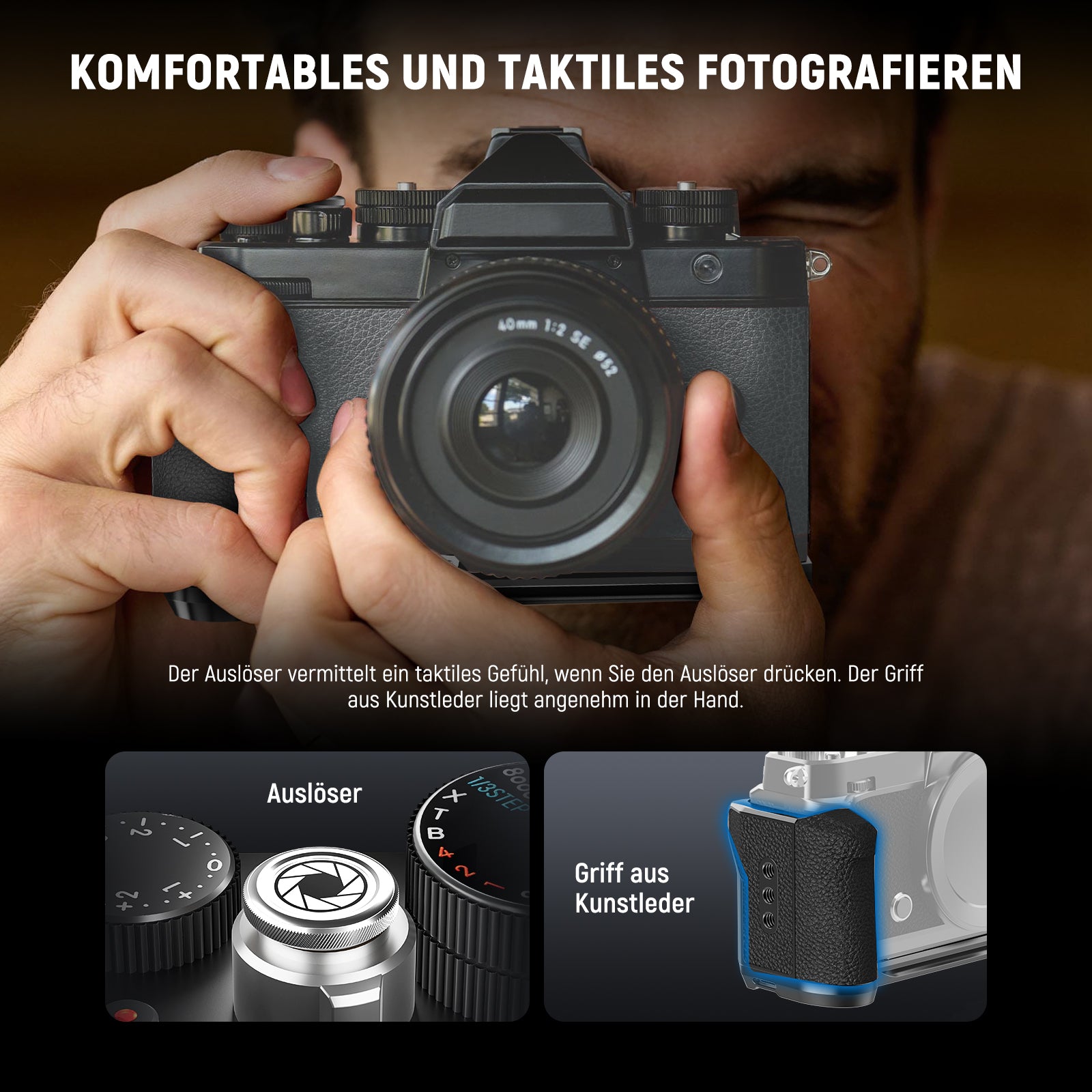 - Integrierter Daumengriff und Handgriff- Die Montageplatte ist mit einem ergonomischen Daumengriff ausgestattet, der für verbesserte Stabilität und Komfort beim Halten der Kamera mit einer Hand sorgt. Darüber hinaus verfügt der Griff über eine rutschfeste Gummibeschichtung, um ein Abrutschen bei Aufnahmen aus der Hand zu verhindern