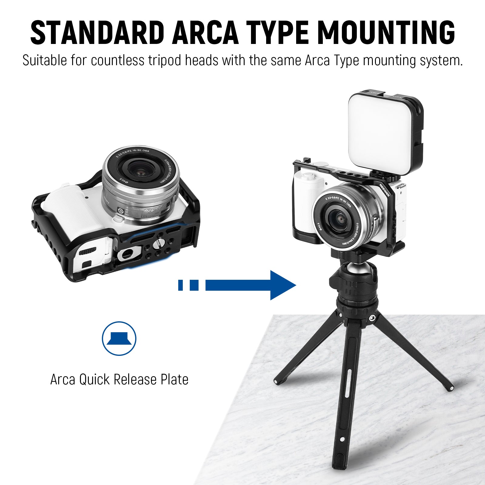 - 【Universeller Arca Typ QR Plattenfuß】 Mit einer Standard Arca Basis kann der Kamerakäfig schnell auf jedem Stativkopf montiert werden, der mit dem Arca Swiss Montagesystem kompatibel ist