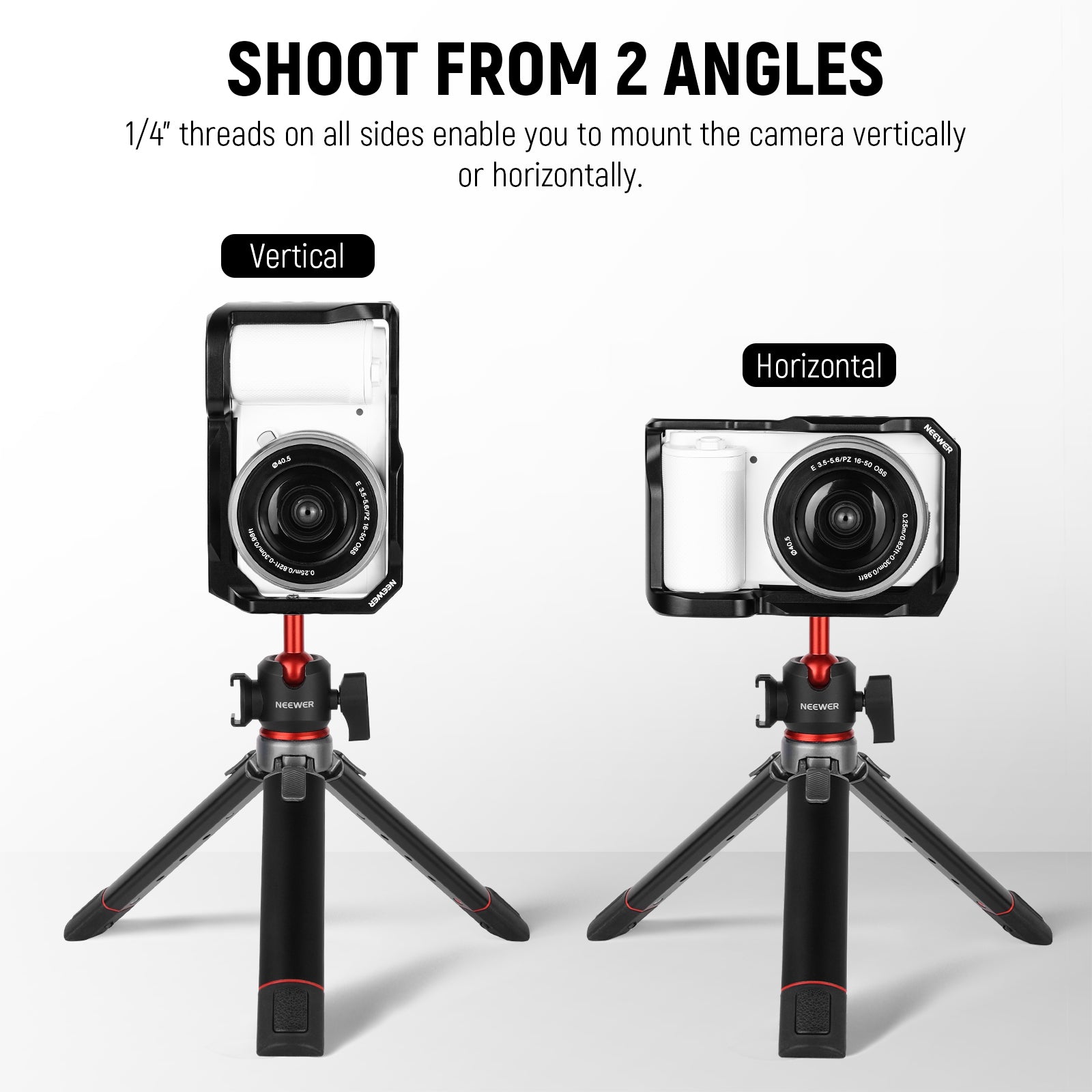 - 【Doppelt gerichtete Aufnahmen】 Jede Seite des Kamerakäfigs verfügt über mehrere 1/4" Gewinde, die es Ihnen ermöglichen, Ihre Kamera auf einem Stativ oder einem Handgriff in vertikaler und horizontaler Ausrichtung zu montieren