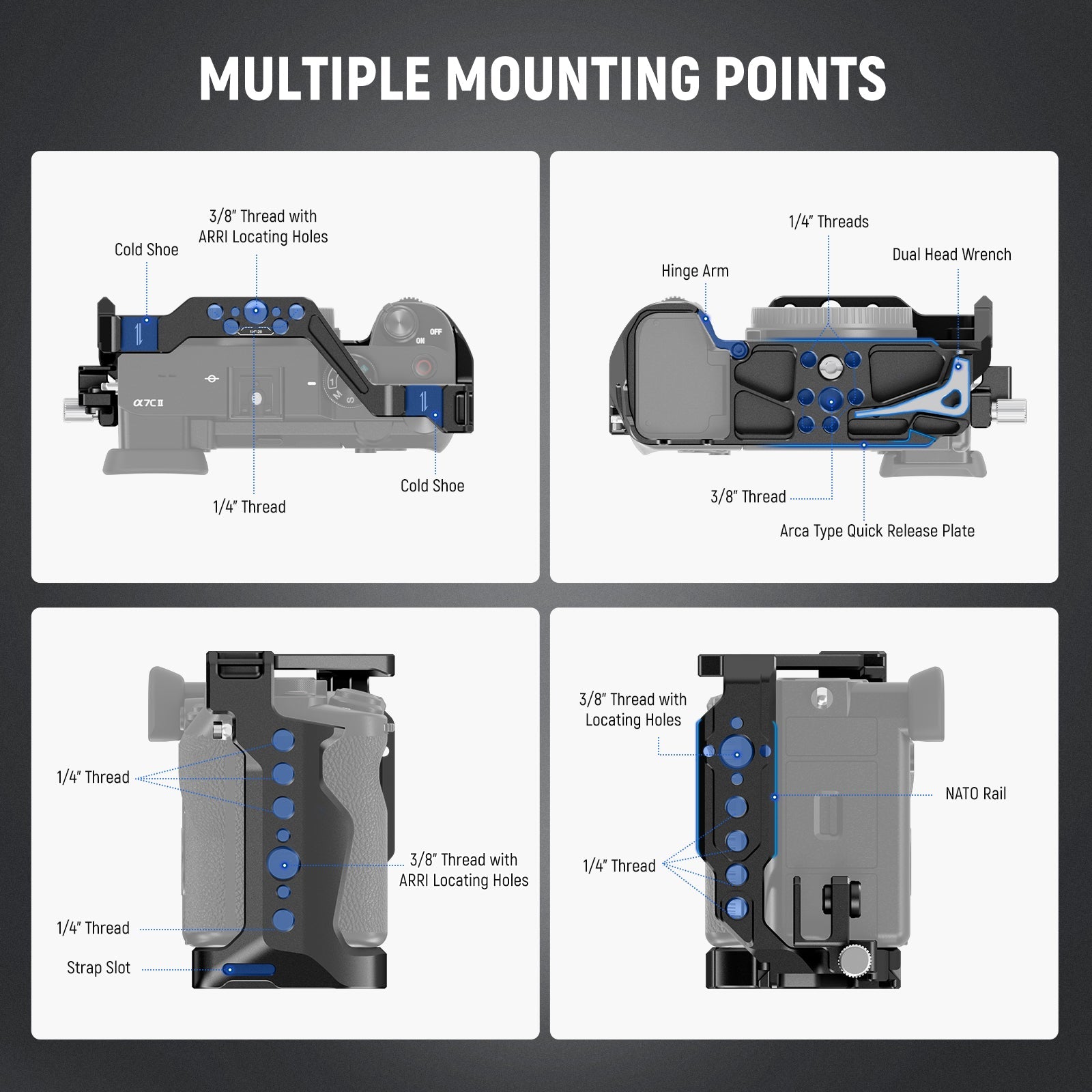 • 【Verfügbare Zubehör Befestigungspunkte】 Rüsten Sie den Käfig zur funktionalen Erweiterung aus. 1/4" Gewinde, 3/8" Gewinde mit ARRI Positionierungslöchern, ein Cold Shoe und eine NATO Schiene ermöglichen den Anschluss eines Mikrofons (CM14 PRO), einer Monitorhalterung (MA004), einer LED Leuchte (PL81) und eines seitlichen Griffs ( CA023H) und den magischen Arm (ST15) am Käfig oder montieren Sie den Käfig in horizontaler Ausrichtung auf einem Stativ