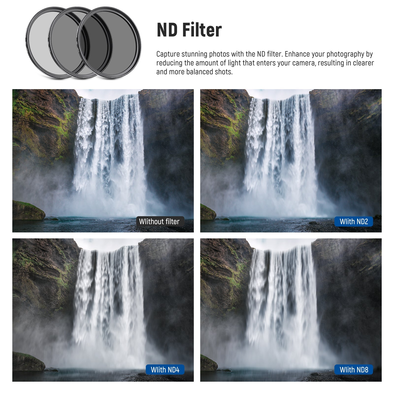 - 【Ausgewogene Belichtung mit ND Filtern】 Neutraldichtefilter reduzieren die Lichtmenge, die in den Kamerasensor eindringt, um verschiedene Stufen, ND2 um 1 Stufe, ND4 um 2 Stufen und ND8 um 5 Stufen, um eine ausgewogene Belichtung über Bilder unter verschiedenen Lichtbedingungen zu erreichen. Diese ND Filter ermöglichen auch Langzeitbelichtungen, indem sie die Verschlusszeit verlangsamen
