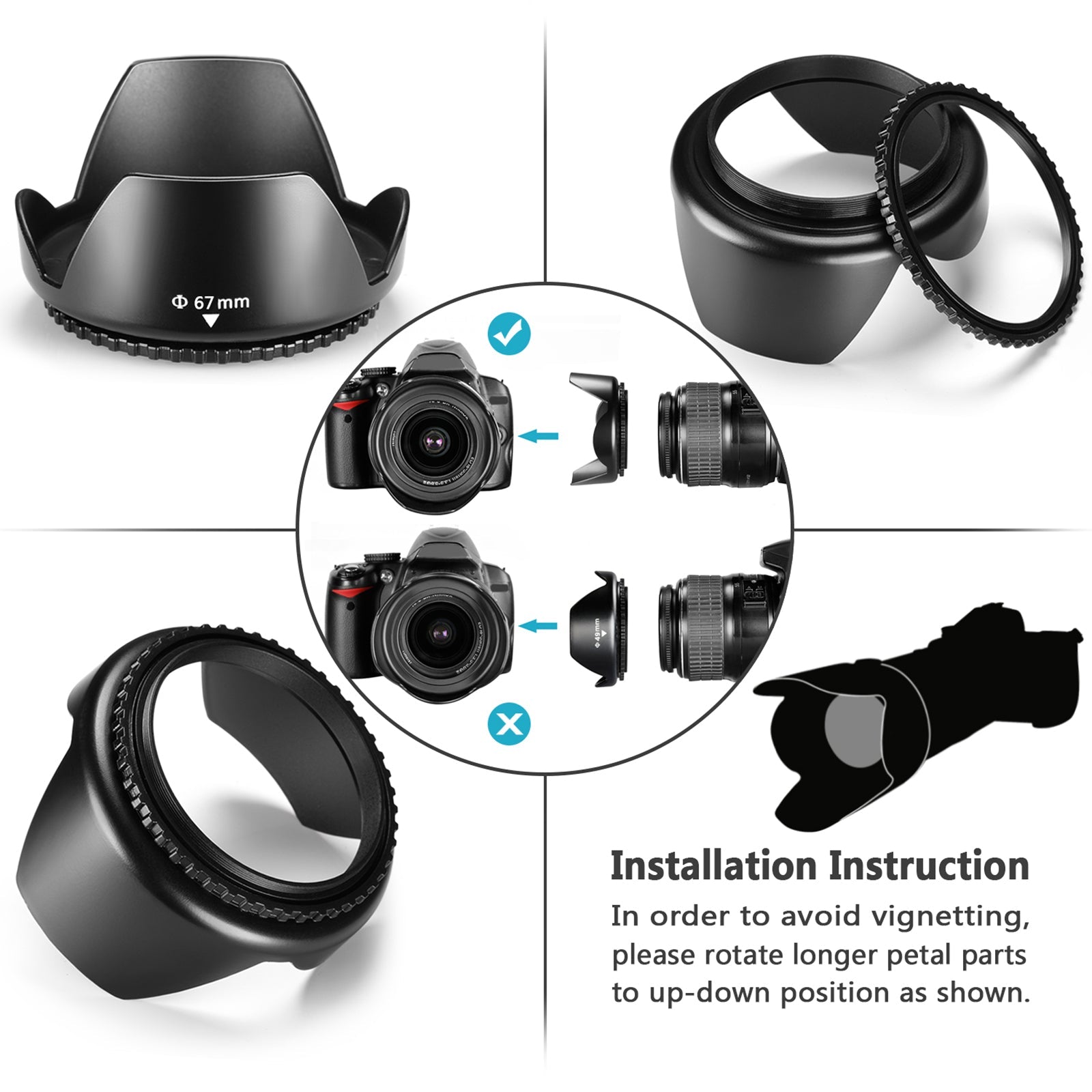 - 【Zwei Blenden im Lieferumfang enthalten】 Eine tulpenförmige Blende und eine zusammenklappbare Blende aus Gummi helfen, übermäßiges Sonnenlicht zu blockieren und Blendung und Streulicht zu reduzieren. Die zusammenklappbare Gegenlichtblende aus Gummi kann für mehr Vielseitigkeit in drei Formen gefaltet werden: Tulpe, Blume und Pedal. Die Tulpen Blende eignet sich gut für Weitwinkelobjektive, da sie keine Vignettierung verursacht