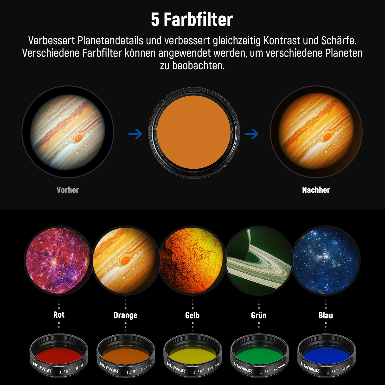 - 【5 Farbfilter】 5 Farbfilter verbessern Ihre Planetenbeobachtung. Rot: Hebt Merkur und Venus tagsüber vom blauen Himmel ab. Orange: Erhöht den Kontrast zwischen hellen und dunklen Bereichen und durchdringt Wolken. Gelb: Bringt polare Eiskappen auf dem Mars zum Vorschein. Grün: Verbessert Frostflecken, Oberflächennebel und Polarprojektionen auf dem Mars. Blau: Teilt den Doppelstern Antares bei maximalem Abstand