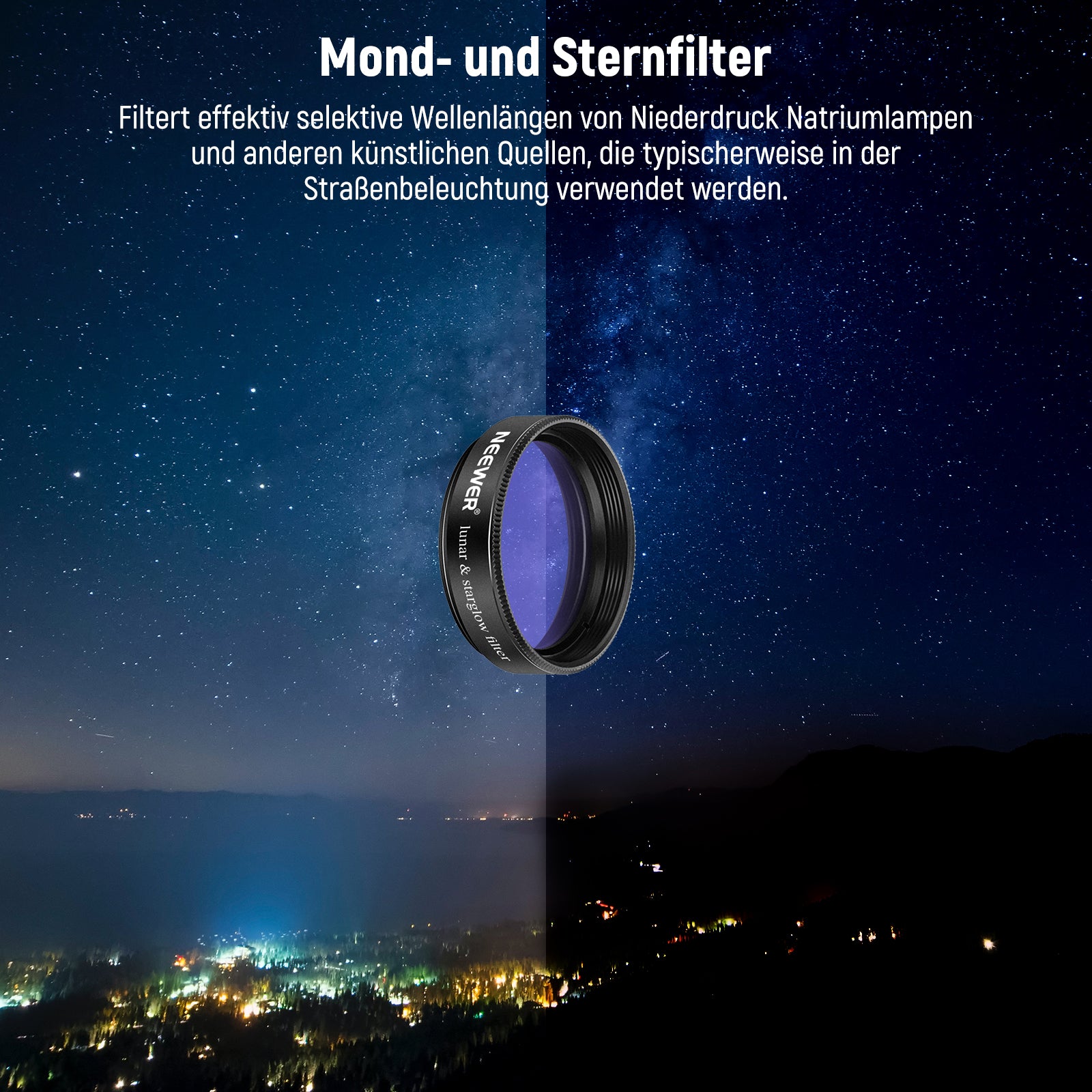 - 【Mond und Sternfilter】 Minimiert Blendung, bringt Oberflächendetails hervor und erhöht den Kontrast; filtert auch effektiv selektive Wellenlängen von Niederdrucknatrium und Straßenlaternenbeleuchtung heraus