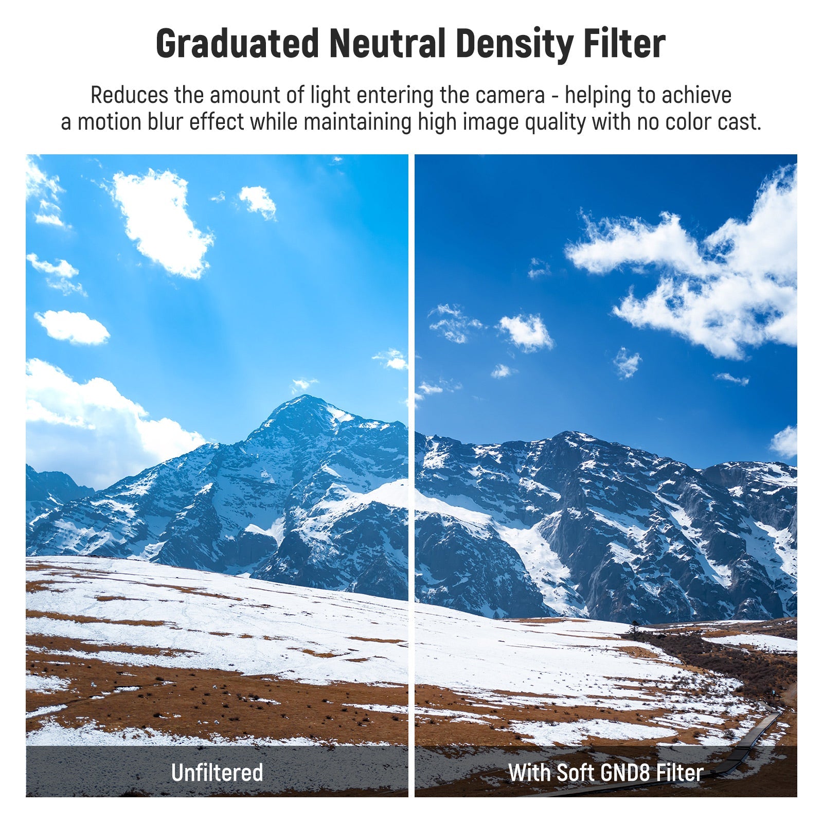 - 【Ausgewogene Belichtung mit 3 Stopps】 Der GND8 Filter (3 Stopps), der abgestufte Neutraldichtefilter, wurde entwickelt, um einen Teil des Lichts gleichmäßig durchzulassen und einen Teil des Bildes abzudunkeln, um eine ausgewogenere Gesamtbelichtung über das Bild zu erreichen. Indem der Kontrast zwischen hellen Teilen und Schattenbereichen verringert wird, können Sie kinoreife Himmelsaufnahmen mit ausgewogener Belichtung zwischen Himmel und Boden auf dem Bild machen