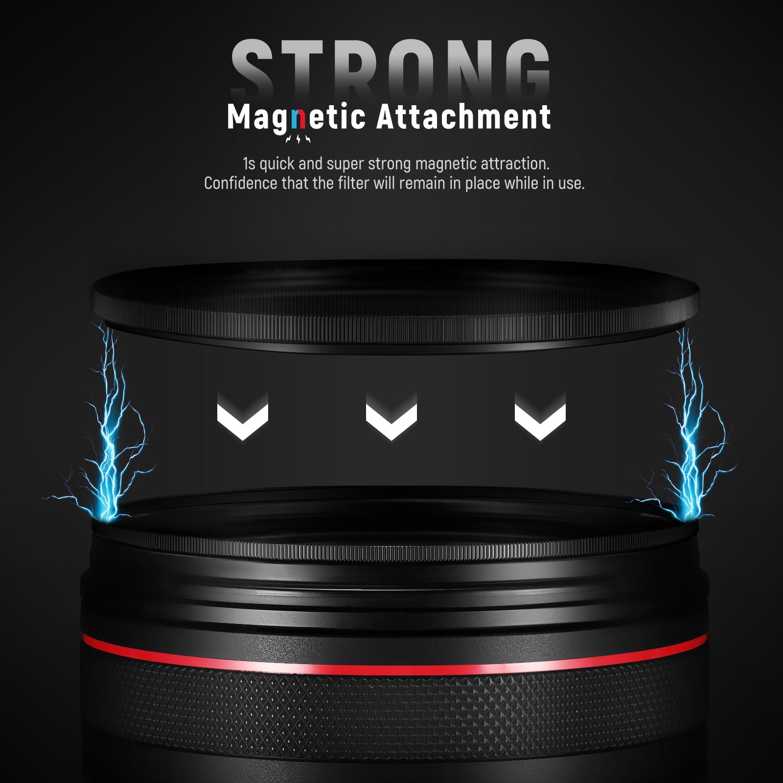 - 【Schneller Filterwechsel in 1 Sekunde】 Die magnetische Befestigung wurde entwickelt, um Benutzern das schnelle Wechseln von ND-Filtern während der Aufnahme zu ermöglichen. Schrauben Sie den mitgelieferten magnetischen Adapterring in das 49mm Kameraobjektiv und der Filter wird in Sekundenschnelle magnetisch an Ihr Kameraobjektiv gesaugt. Durch die verbesserte Magnetkraft sitzt der Filter fest und löst sich auch nicht so leicht