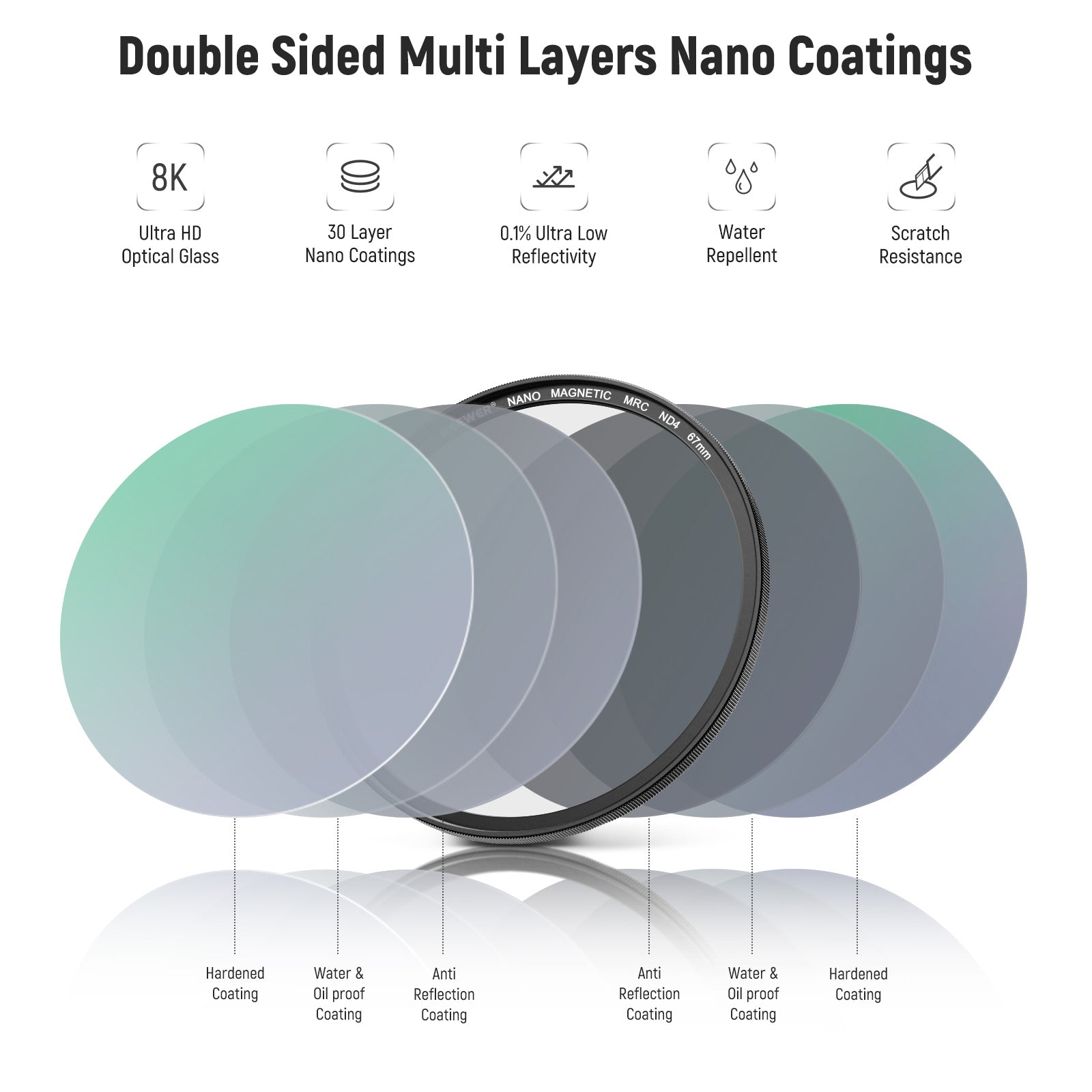 - 【Multiresistente Nanobeschichtungen】 30 Schichten Nanobeschichtung auf beiden Seiten des optischen HD-Glases machen den Filter wasser-, staub- und kratzfest. Die Mehrschichtbeschichtungstechnologie eliminiert auch Reflexionen und Blendung