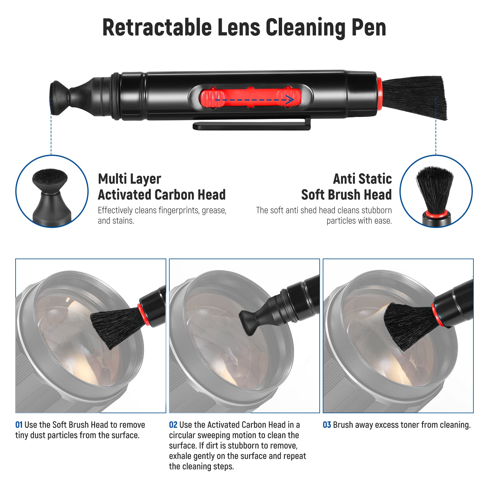 - Einfache alltägliche Reinigung- Ein ausziehbarer Objektivreinigungsstift und ein Reinigungstuch helfen Ihnen dabei, Staub, Schmutz, Fingerabdrücke und Flecken von Filtern und Linsen zu entfernen, ohne sie zu zerkratzen