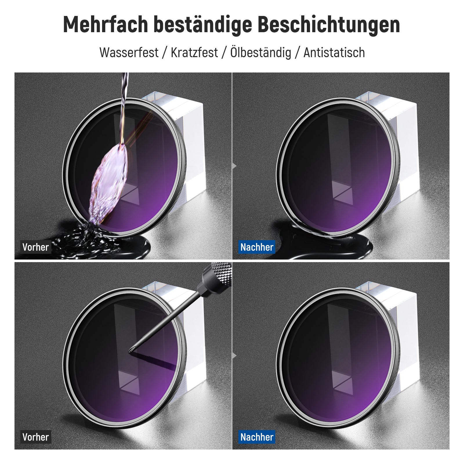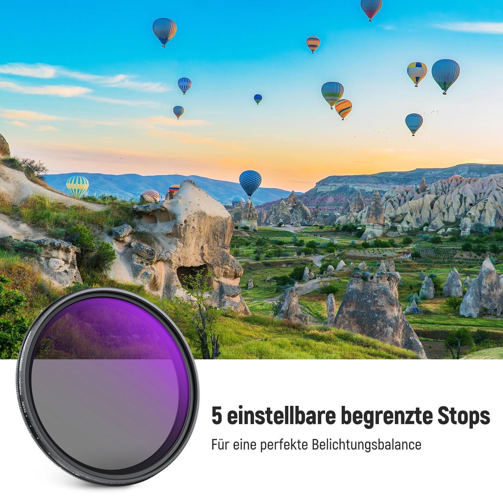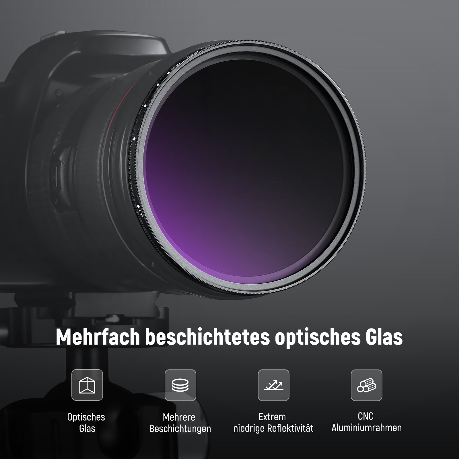 - Variabler ND Filter- Dieser variable ND2-32 Graufilter reduziert das einfallende Licht und ermöglicht Aufnahmen mit längeren Verschlusszeiten und größerer Blendenöffnung bei unterschiedlichen Lichtverhältnissen. Ideal für Aufnahmen von Flüssen, Wasserfällen, Lichtspuren und anderen bewegten Motiven mit dynamischer Bewegungsunschärfe.