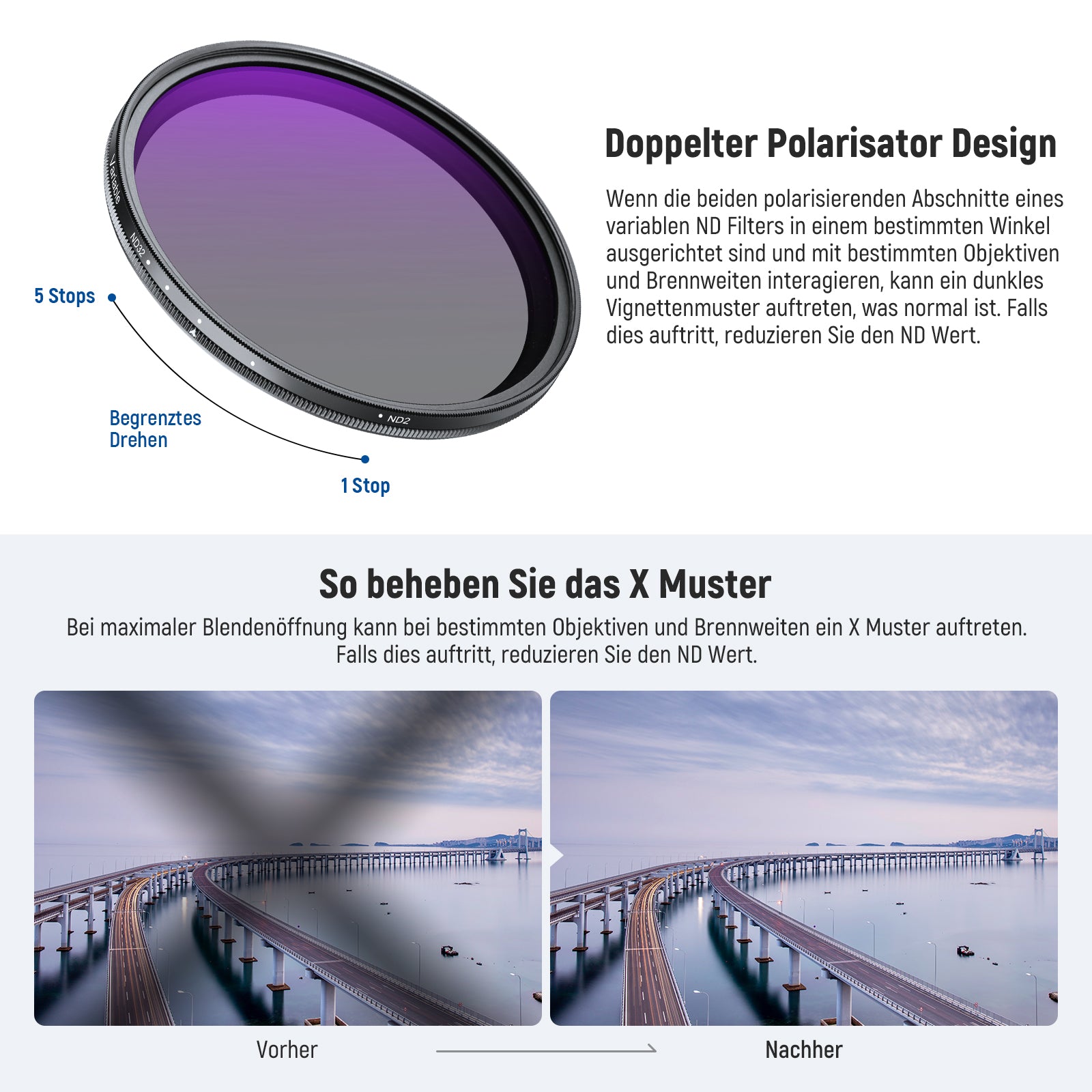 Hinweis- 1. Variable ND Filter arbeiten nach dem Polarisationsprinzip. Bei maximaler Blendenöffnung kann bei bestimmten Objektiven und Brennweiten ein X Muster auftreten. Reduzieren Sie in diesem Fall den ND Wert. 2. Für Langzeitbelichtungen, die eine erhebliche Lichtreduzierung erfordern, eignen sich feste ND Filter wie ND64 oder ND1000. 3. Dieser Filter verwendet Objektivdeckel und Gegenlichtblenden.