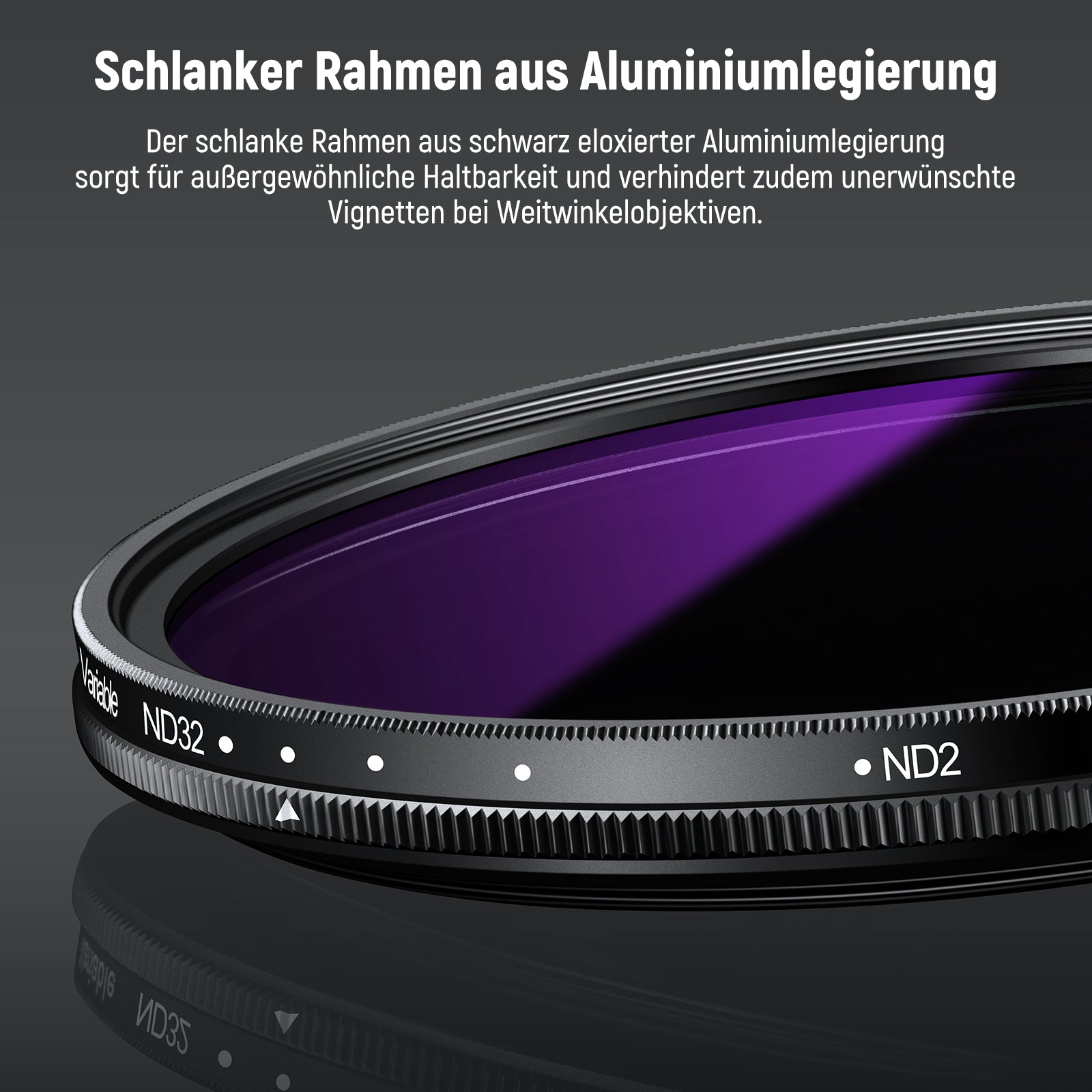 - Präzise ND Einstellung- Drehen Sie das markierte Einstellrad, um präzise ND Werte von ND2 bis ND32 (1 bis 5 Blendenstufen) für eine optimale Belichtungsbalance einzustellen. Hinweis: Variable ND Filter basieren auf dem Polarisationsprinzip. Bei maximaler Blendenöffnung können bestimmte Objektive und Brennweiten aufgrund von Filterinteraktionen ein X Muster erzeugen.