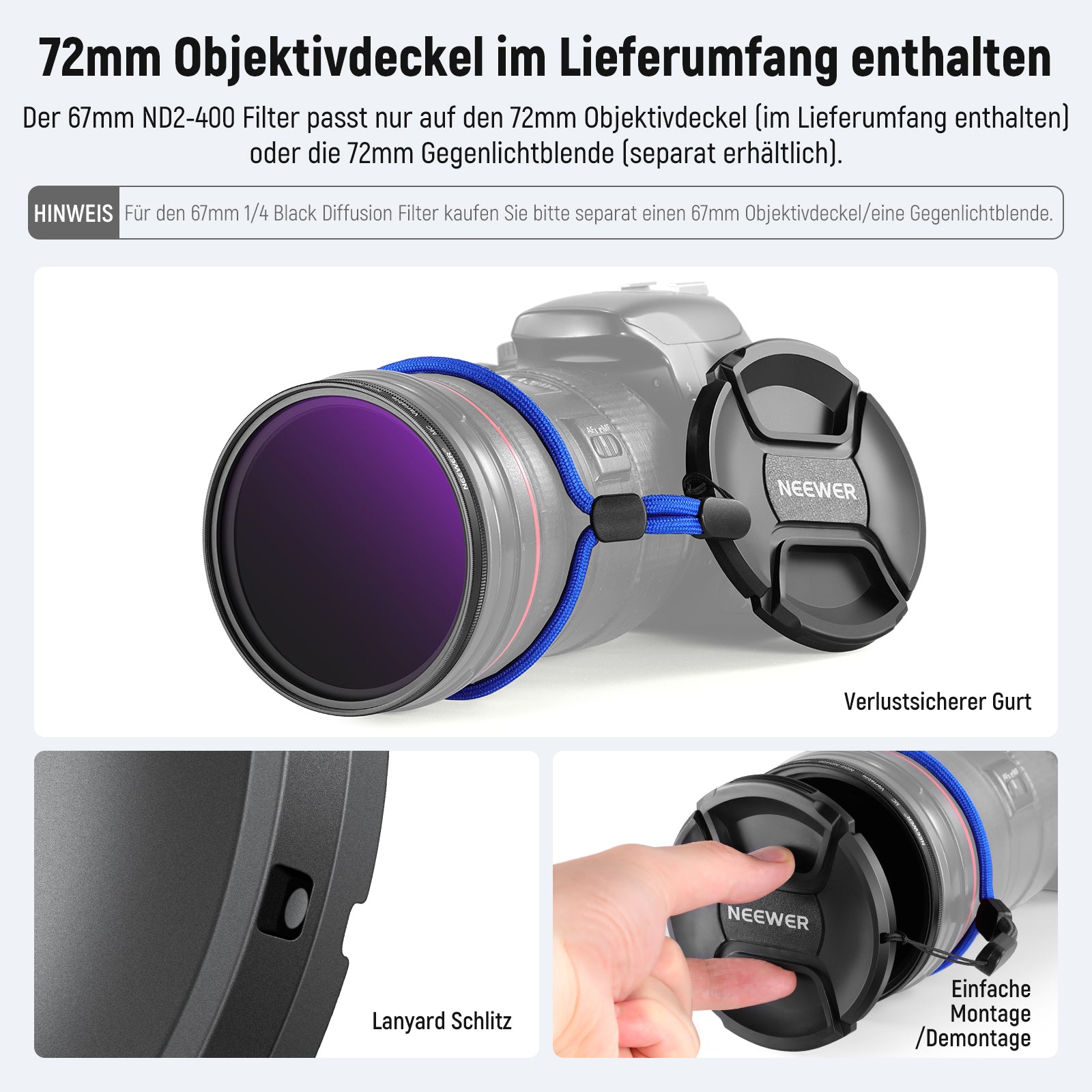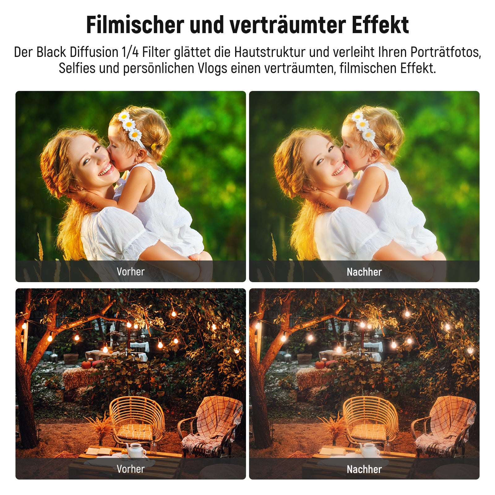 - Kinoreifer Diffusor Effekt- Der Black Diffusion 1/4 Filter glättet die Hautstruktur und verleiht Ihren Porträts, Selfies und persönlichen Vlogs einen verträumten, filmischen Effekt. Eine Schutzkappe mit Trageband ist für den variablen Graufilter im Lieferumfang enthalten