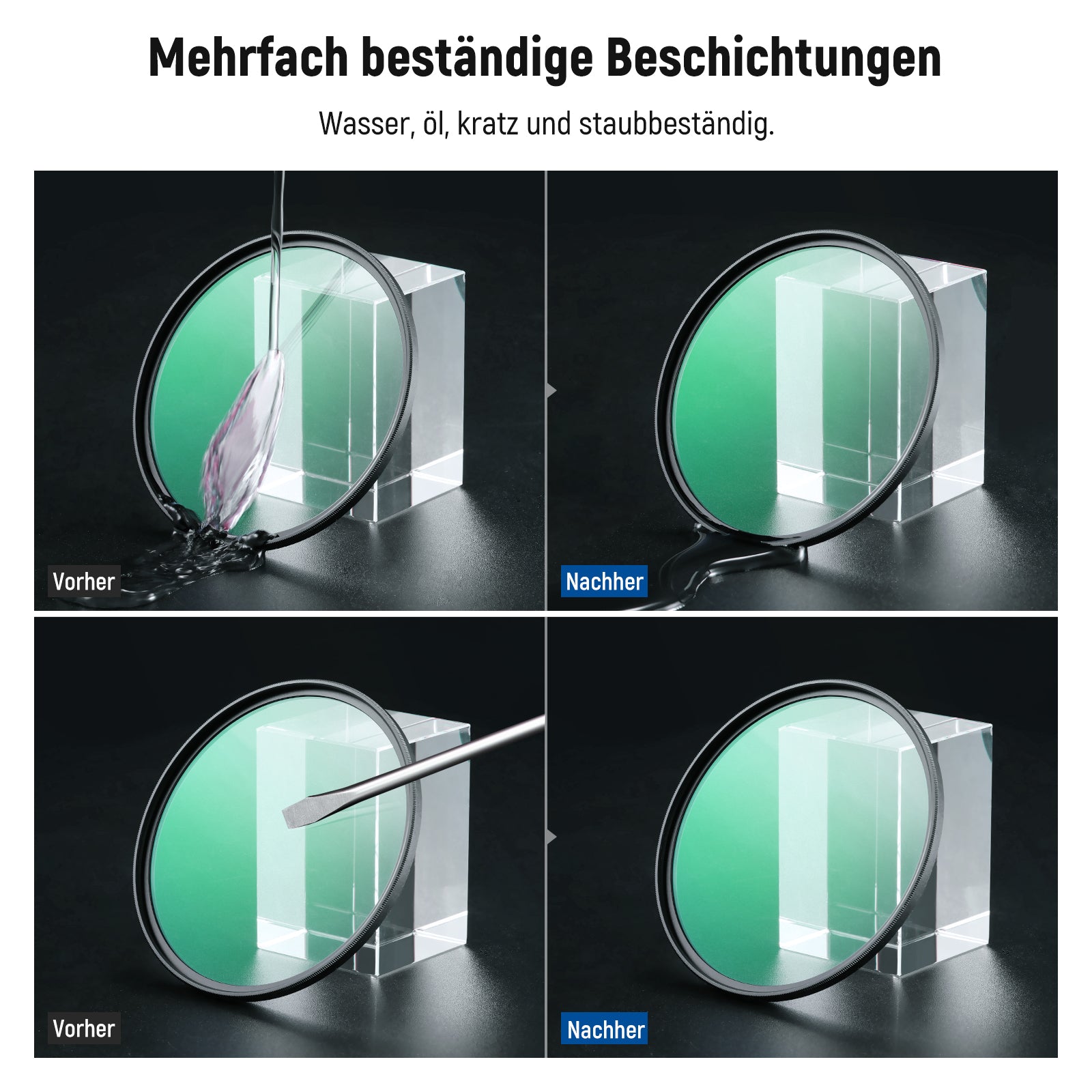 - Mehrfache Schutzbeschichtungen- Mehrschichtige Schutzbeschichtung auf beiden Seiten des optischen Glases kann Wasser, Öl, Staub und Kratzern wirksam widerstehen. Ein Reinigungstuch für die tägliche Pflege ist im Lieferumfang enthalten