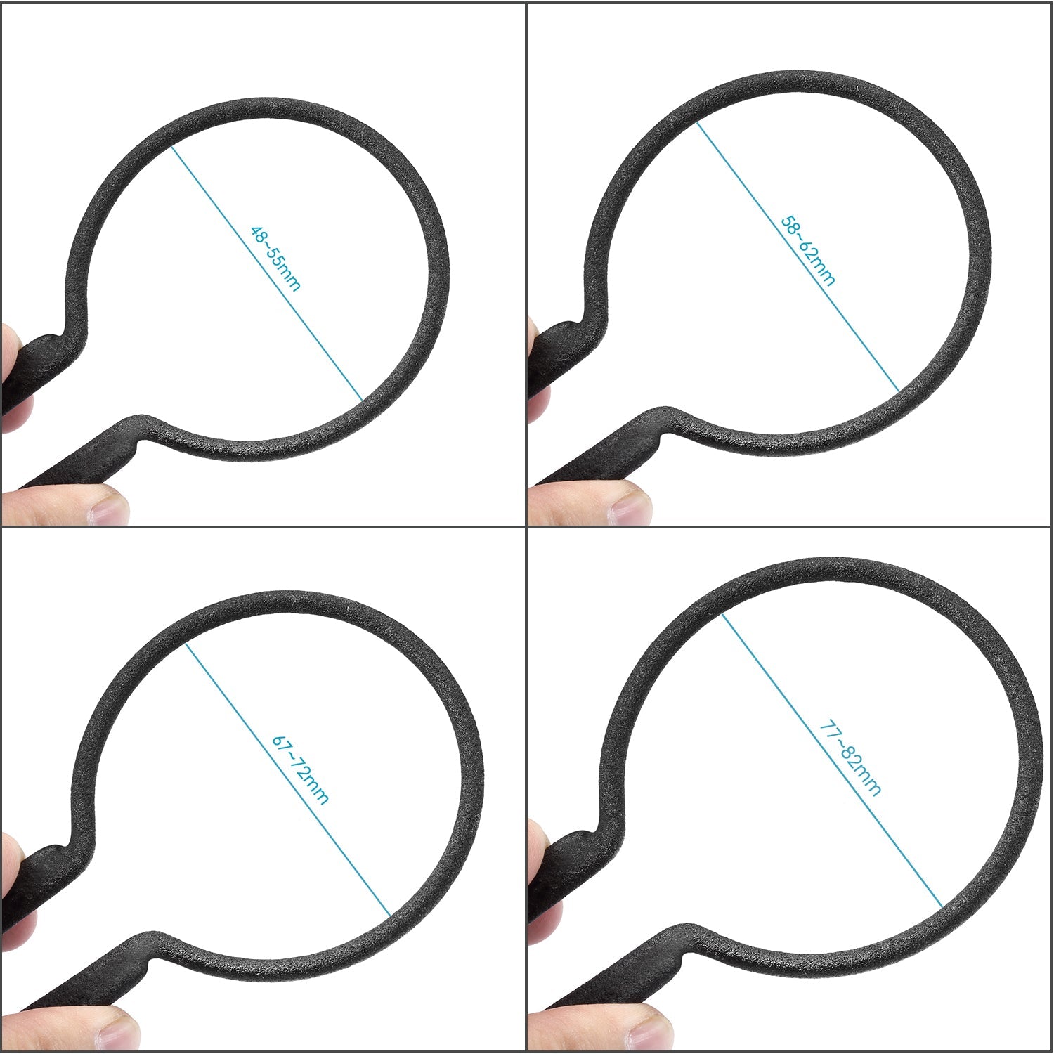 - Kit beinhaltet: 4 Packungen (8 Stück) Filter Entferner Schraubenschlüssel 48–55 mm, 58–62 mm, 67–72 mm, 77–82 mm