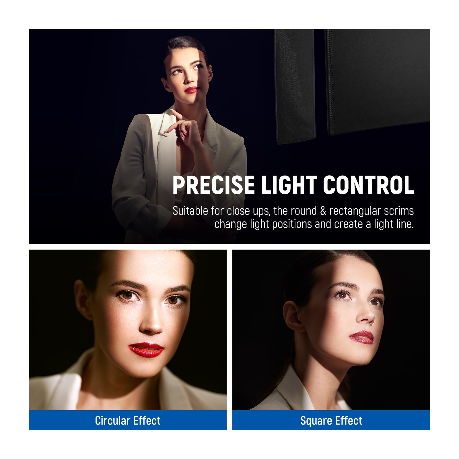 - 【Runde & rechteckige Formen】 Zwei ø6" (16cm) runde Scrims (Punkte) und zwei 4 "x14" (10x35,5cm) rechteckige Scrims (Finger) sind für kleine Aufnahmeumgebungen geeignet. Ihre Funktion besteht darin, die Lichtpositionen fein zu justieren und Reflexionen zu verhindern. So können Fotografen das Licht genau steuern und sowohl dunkle Schatten als auch helle Lichter erzeugen