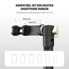 - Mehrwinkelarm mit Kugelkopf- Der flexible Arm verfügt über zwei Gelenke mit 180° Neigungswinkel, während der obere Abschnitt sich 360°drehen und mittels Drehknopf fest arretiert werden kann. Der Kugelkopf aus Alu. an der Oberseite ermöglicht ebenfalls 360°Rotation und 90° Neigung für Overhead Halterungen. Der mitgelieferte Smartphone Halter besitzt seitliche und untere 1/4" Gewindebohrungen, wodurch er einfach am Kugelgelenk befestigt, schnell zwischen Hoch und Querformat gewechselt werden kann