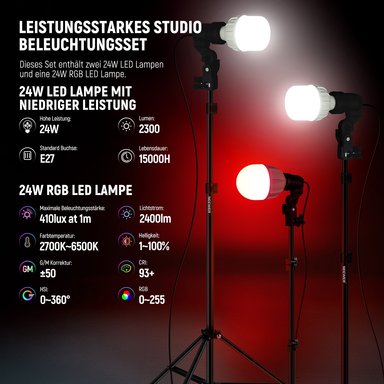 - Leistungsstarkes Studiobeleuchtungsset- Dieses Set enthält zwei 24W LED Lampen und eine 26W RGB LED Lampe. Jede 24W LED Lampe entspricht einer 200W Glühlampe und bietet eine helle und gleichmäßige Lichtleistung mit einer Farbtemperatur von 5700K für natürliches und ausgewogenes Tageslicht für Ihre Aufnahmen. Die App gesteuerte 26W RGB LED Lampe verfügt über 9 Effekte, 400Lux/m, 2700K–6500K Farbtemperatur, hohen CRI 93+ und TLCI 98+ und sorgt so für dramatischere Szenen in der Fotografie