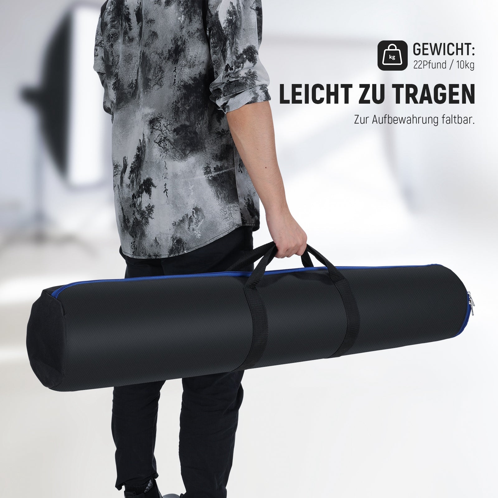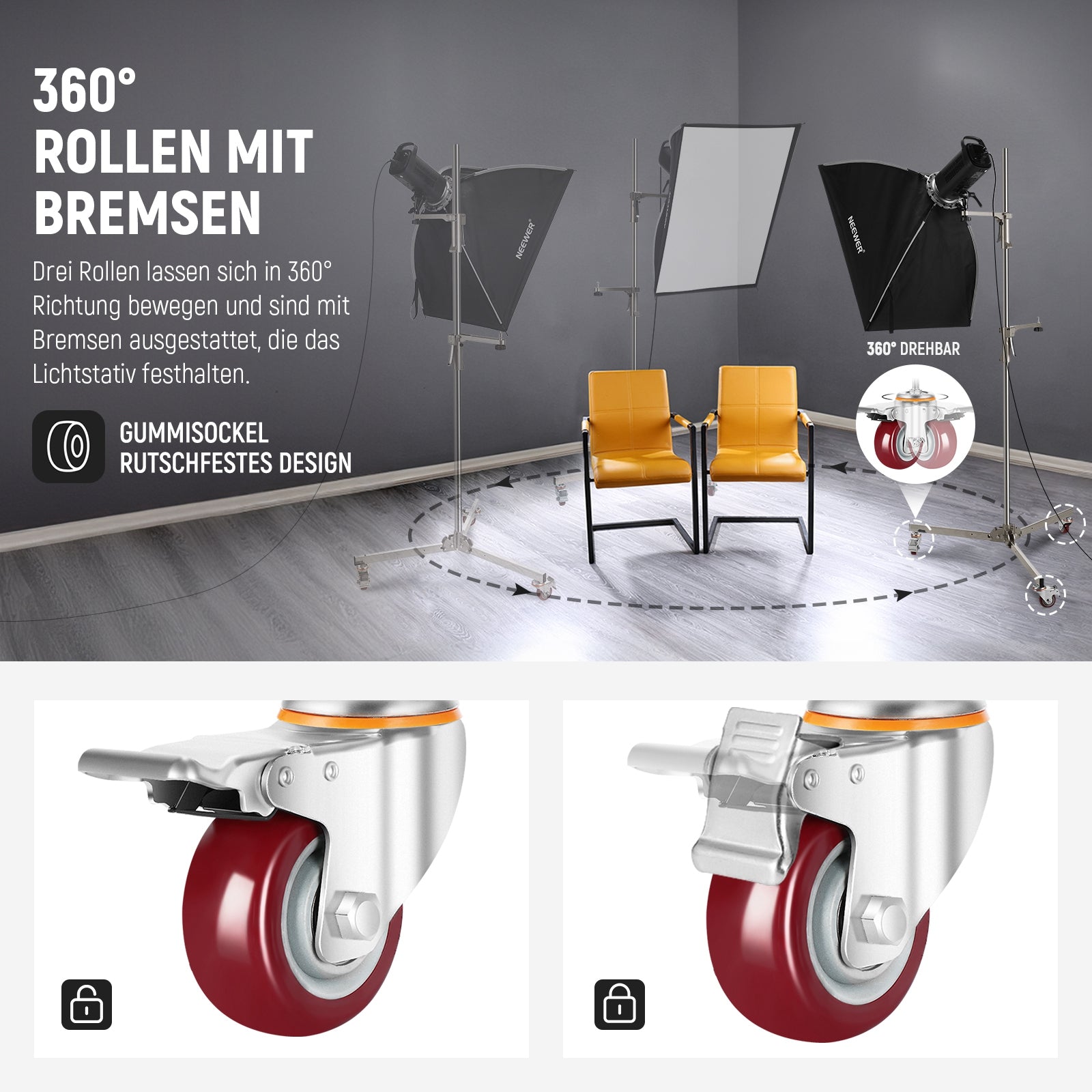 • 【360° Rollen mit Bremsen】 Drei Rollen können am Stativbein befestigt werden und ermöglichen ein müheloses Rollen von Stativ und Ausrüstung auf dem Boden. Sie können sich in 360° Richtung bewegen und verfügen über Bremsen, die das Lichtstativ festhalten