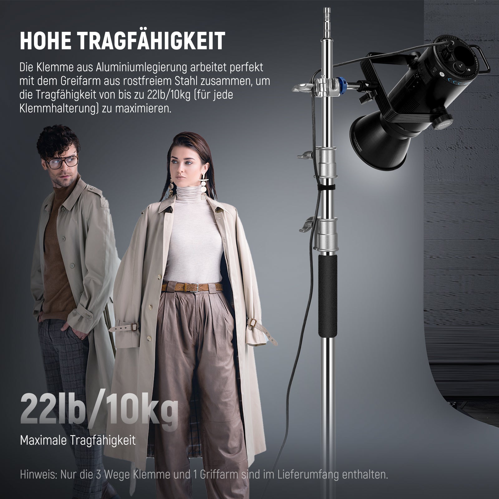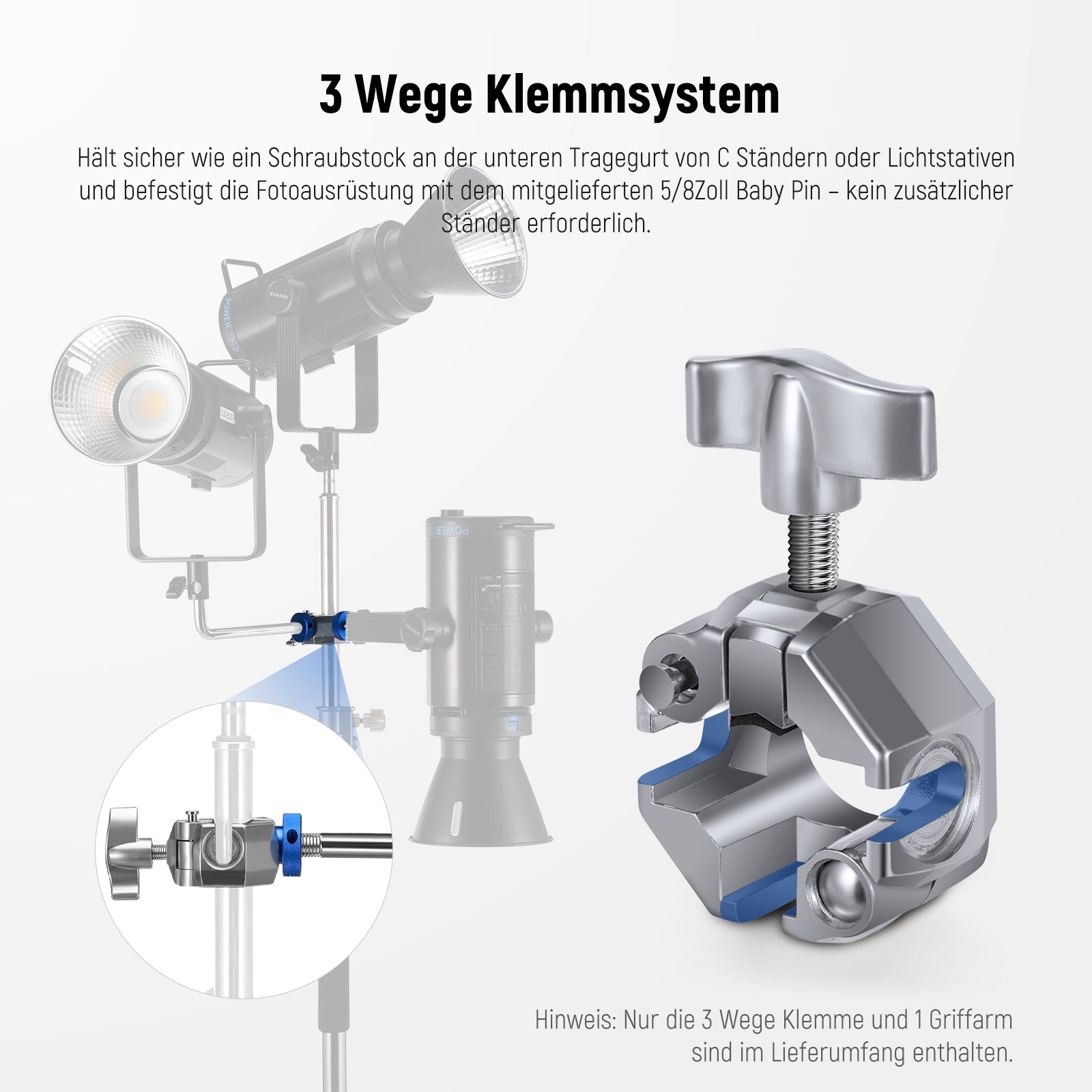 - 【3 Wege Klemme mit Baby 5/8" Bolzen】 Die NEEWER 3 Wege Klemme greift wie ein Schraubstock sicher an der unteren Steigung eines C Stativs und eines Lichtstativs (Rohrdurchmesser innerhalb von 1"-1,4"/25-35mm) und ermöglicht so die Befestigung von Fotoausrüstung mit dem mitgelieferten Baby Pin Stud 5/8Zoll Empfänger, ohne dass ein zusätzliches Lichtstativ erforderlich ist
