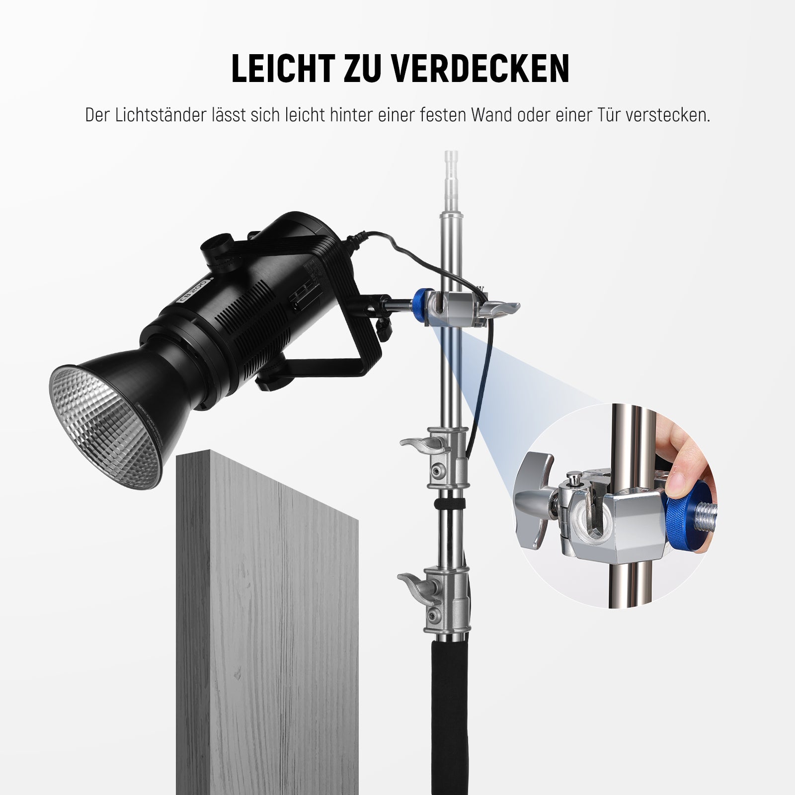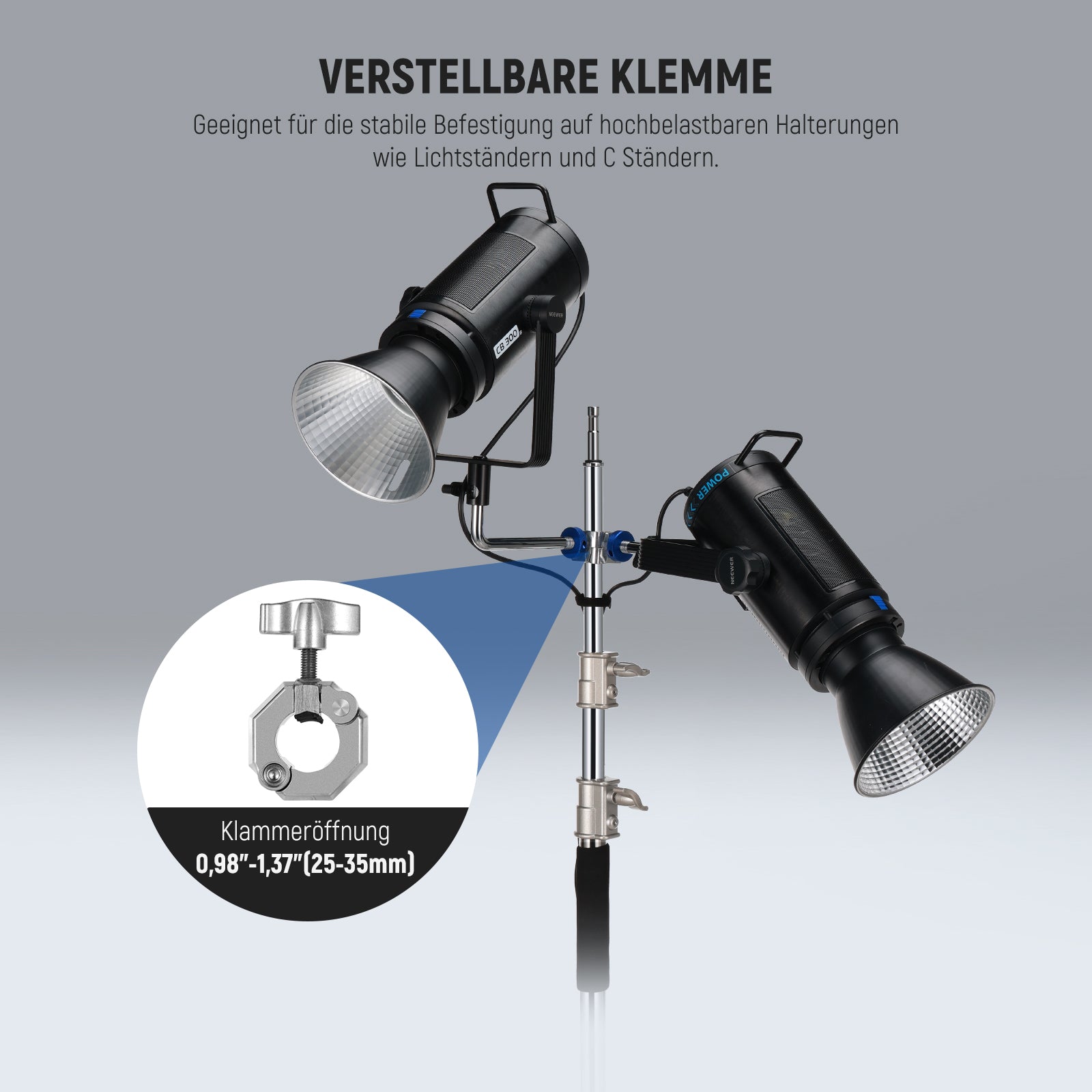 - 【Schnellverschluss und einfache Einrichtung】 Zum Schnellverschluss einfach drücken oder die Montageklemme an C Ständern, Lichtstativen und anderen Stangen mit Durchmessern von 25 bis 35mm(1" bis 1,4") anbringen und dann mit dem Sicherungsring hoch oder niedrig sichern
