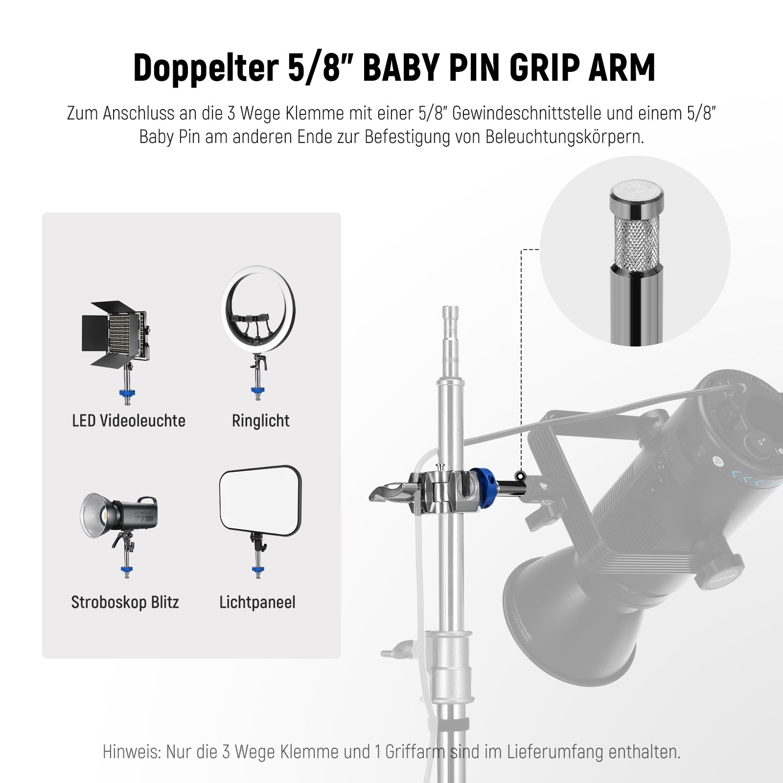- 【5/8" Babystift und Gewindeschnittstelle】 Der 4,1"/105mm Greifarm mit einer 5/8" Gewindeschnittstelle lässt sich nahtlos mit dem Griffkopf anschließen und verfügt am anderen Ende über einen 5/8" Baby Stift zur Befestigung von LED Videoleuchten, Flächenleuchten, Ringleuchten, Stroboskopblitze, Studioleuchten, Monoleuchten, Mikrofonen, Softboxen und mehr. Es kann mit einem Griffkopf und einem Griffarm verwendet werden, um weitere Befestigungsmöglichkeiten zu erhalten
