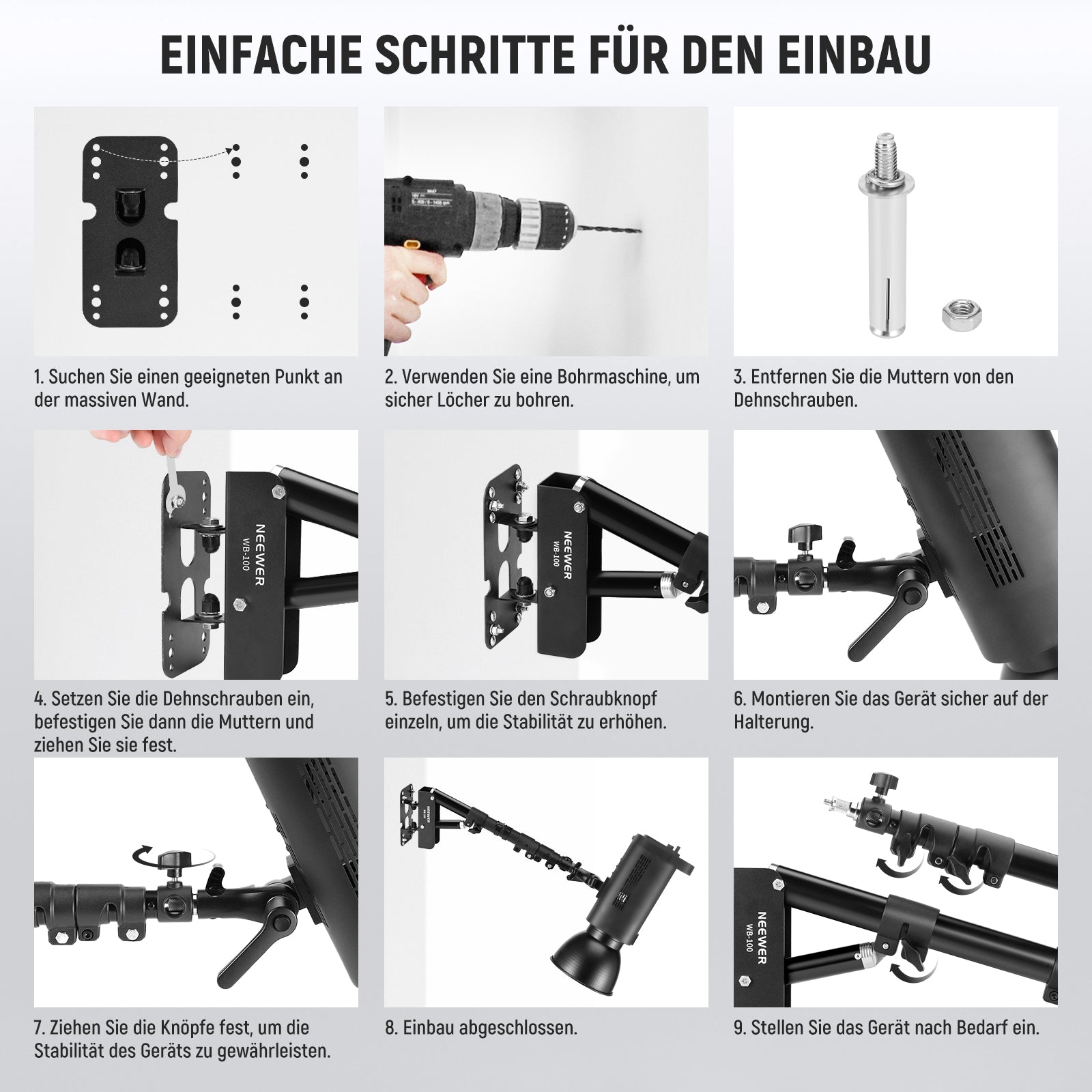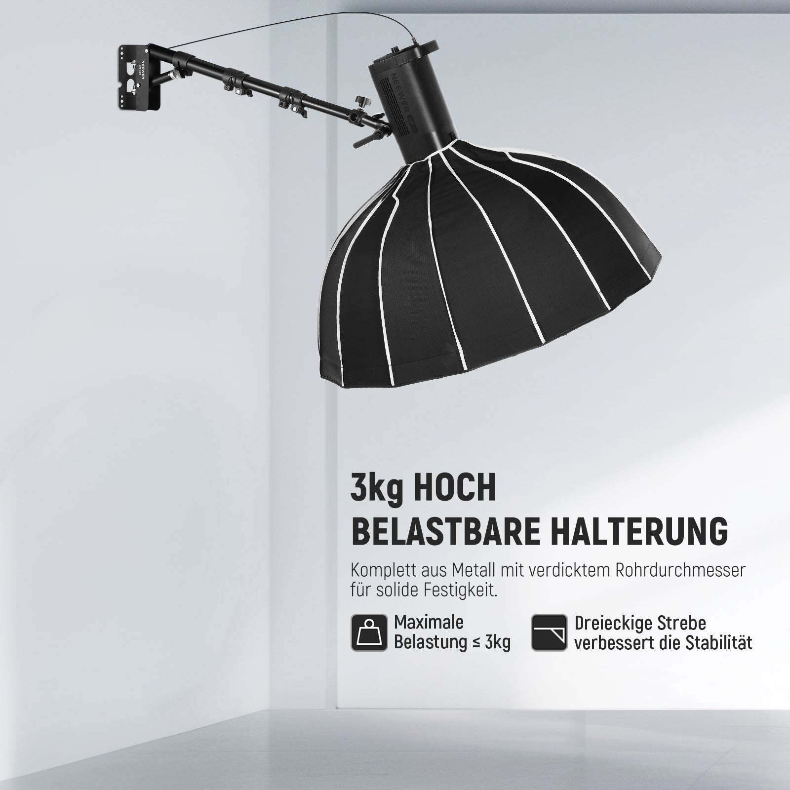 - Leichte Wandhalterung zum Platzsparen- Für Fotografen, die Platz sparen möchten, ist dieser Auslegerarm zur Wandmontage eine ideale Alternative zu Bodenlichtstativen. Der Wandhalterungsarm hilft Ihnen, Ihre Ausrüstung an der richtigen Stelle zu positionieren, damit Sie sie kreieren können, ohne wertvollen Platz zu beanspruchen, da er nach dem Einfahren nur 55cm lang ist und flach an die Wand geklappt werden kann, um Ihr Studio ordentlich zu halten