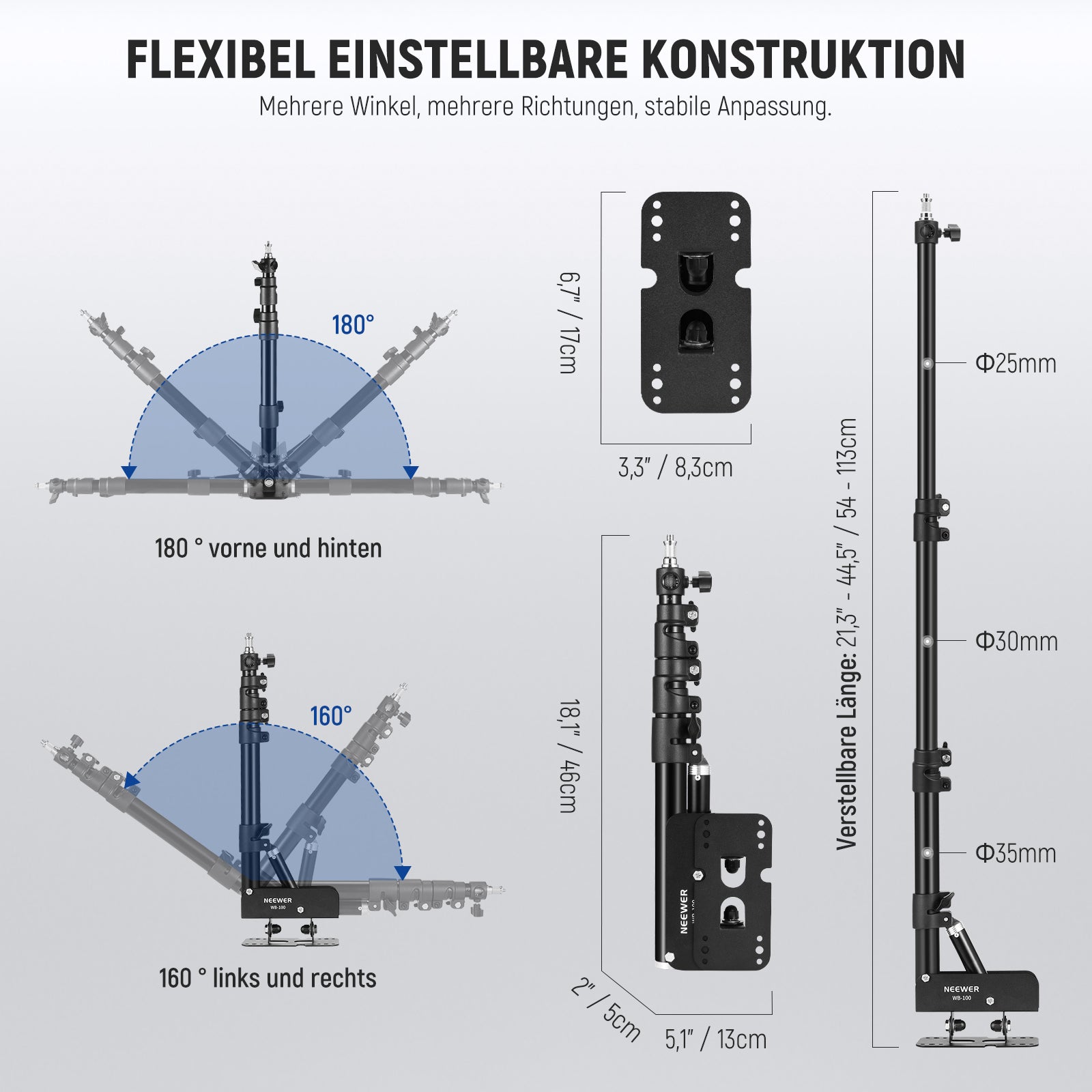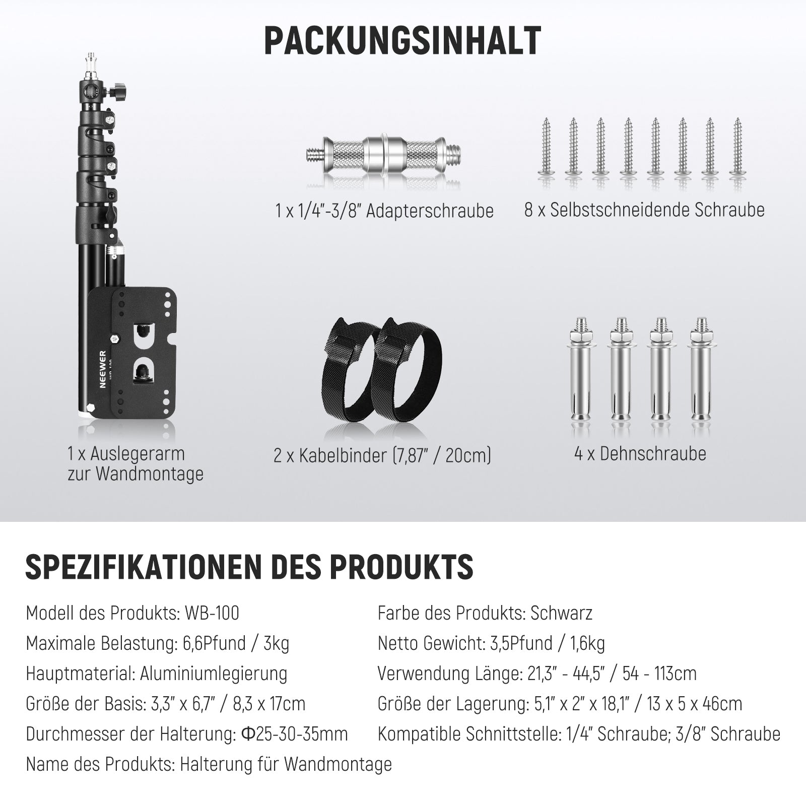 - Robuste Konstruktion mit einer Gewichtskapazität von 6,6Pfund/3kg- NEEWER WB-100 Ringlicht Auslegerarm ist aus einer robusten Aluminiumlegierung gefertigt und daher sehr langlebig. Mit einer stabilen Dreiecksbasis, die den Arm fest an seinem Platz hält, ohne zu kippen, hält er einem Gewicht von bis zu 6,6Pfund/3kg stand. Ein professionelles Zubehör für die Fotografie, das Ihre Ausrüstung sicher für die kreative Arbeit hält