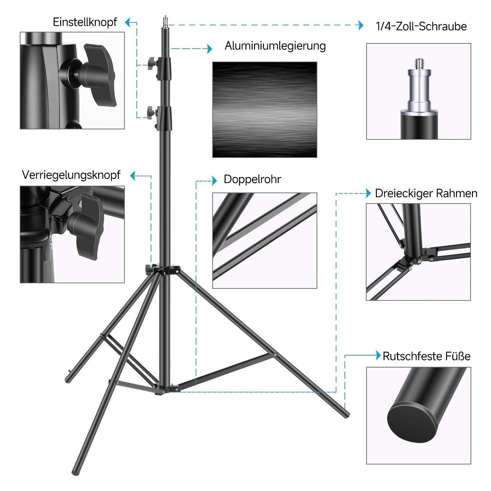 - Stabil und robust: Stabiler dreieckiger Rahmen kombiniert mit Doppelrohr und rutschfesten Füßen. Die beiden Stativstative sind sehr stabil und eignen sich perfekt, um Ihr Licht ohne Wackeln zu stützen. Hergestellt aus einer Aluminiumlegierung für eine lange Lebensdauer. Mit Verriegelungsringen aus Metall für dauerhaften Gebrauch, einfache Einstellung und Verriegelung
