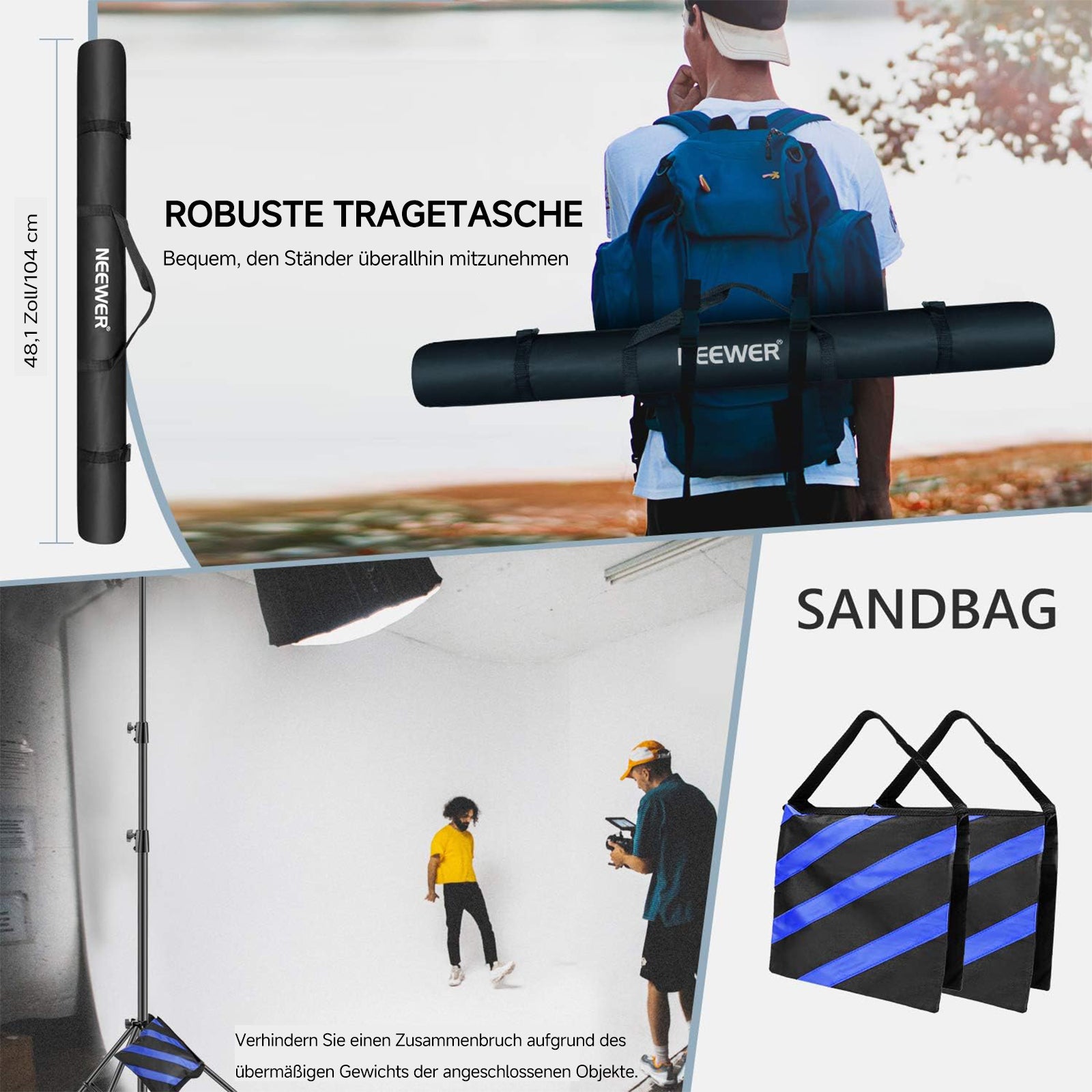 - Hochbelastbare Sandsäcke: Mit den zwei Sandsäcken in Premium-Qualität können Sie das Gegengewicht einfach kontrollieren und Ihr Beleuchtungssetup besser stabilisieren. Das Gleichgewicht des Gewichts liegt bei Ihnen und Sie können das Gewicht des Sandsacks ändern, um Winkel für Ihre Fotografie zu erzeugen