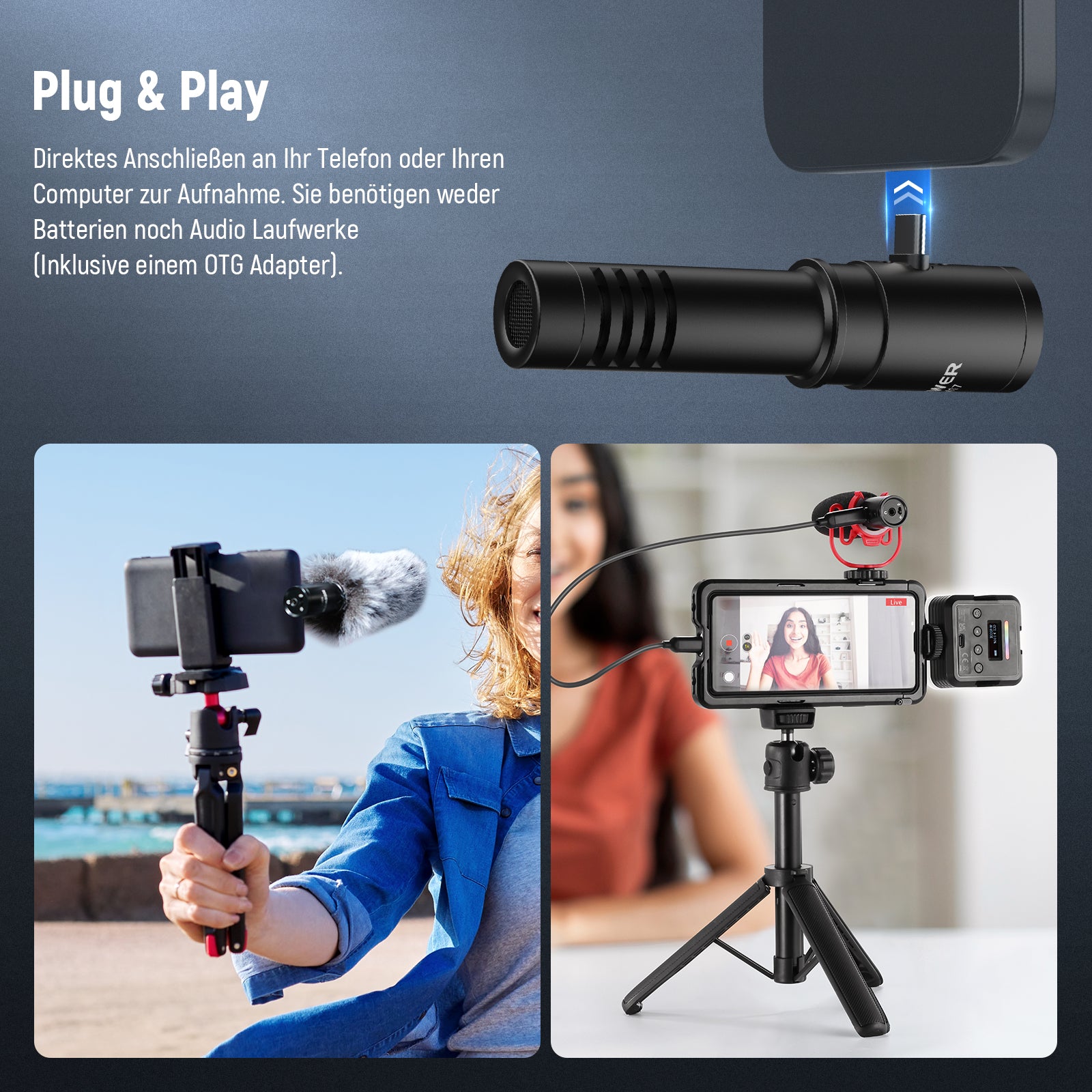 - 【Vielseitige Anwendungen】Das Kit enthält eine Kaltschuhhalterung, um Vibrationsgeräusche zu minimieren, und ein USB C Stecker auf USB C Buchse OTG Kabel für verschiedene Geräte. Ein unverzichtbares kompaktes Mikrofon für Videoaufnahmen, YouTube und TikTok Vlogs, Interviews, Familienurlaube, Reisen, Live Musik, Outdoor Events und Tutorials