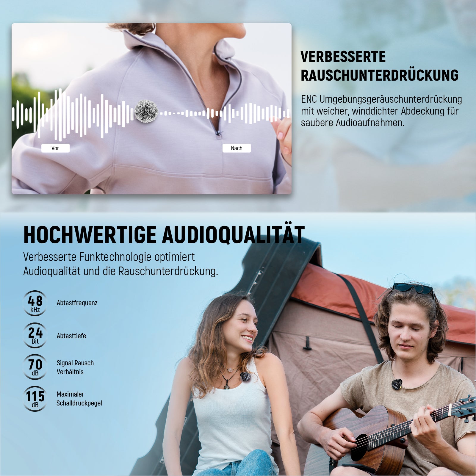 - Drahtloses Mikrofon mit Druckknopf- Jeder Sender wiegt nur 14g(0,49Unzen) und verfügt über ein innovatives Design in Form einer Mini Taste. Dieses kabellose Mini Lavalier Mikrofonsystem verfügt über ein 48kHz/24Bit Audioformat und erfasst jeden Ton mit optimaler Genauigkeit. Es sorgt für hervorragende Audiosignale mit minimalen Hintergrundgeräuschen bei einem Signal Rausch Verhältnis von 78dB und verarbeitet einen maximalen Schalldruckpegel von 115dB für Aufnahmen in Umgebungen mit hohen Tönen
