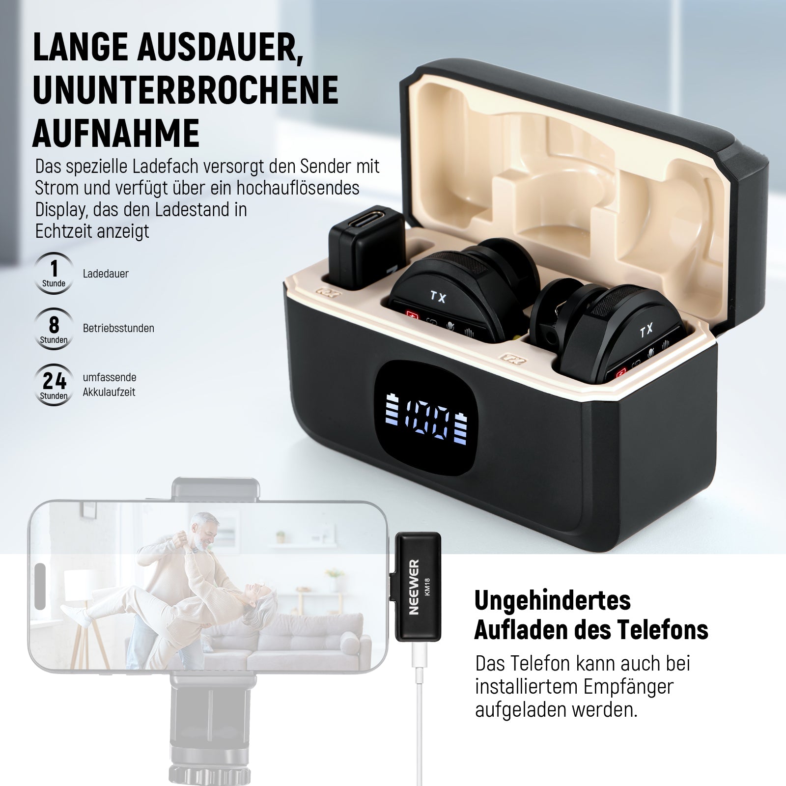 24 Stunden Akkulaufzeit und einfaches Aufladen- Das kompakte Ladegehäuse verfügt über ein HD Display, das den Batteriestand der Sender anzeigt. Jeder Sender kann mit dem Ladegehäuse bis zu 8 Stunden arbeiten und bietet eine Akkulaufzeit von 24 Stunden. Sie können das Ladekabel auch verwenden, um den Sender direkt mit Strom zu versorgen. Sie können Ihr Telefon auch über den Anschluss des RX aufladen, perfekt für längere Audioaufnahmen ohne Unterbrechung