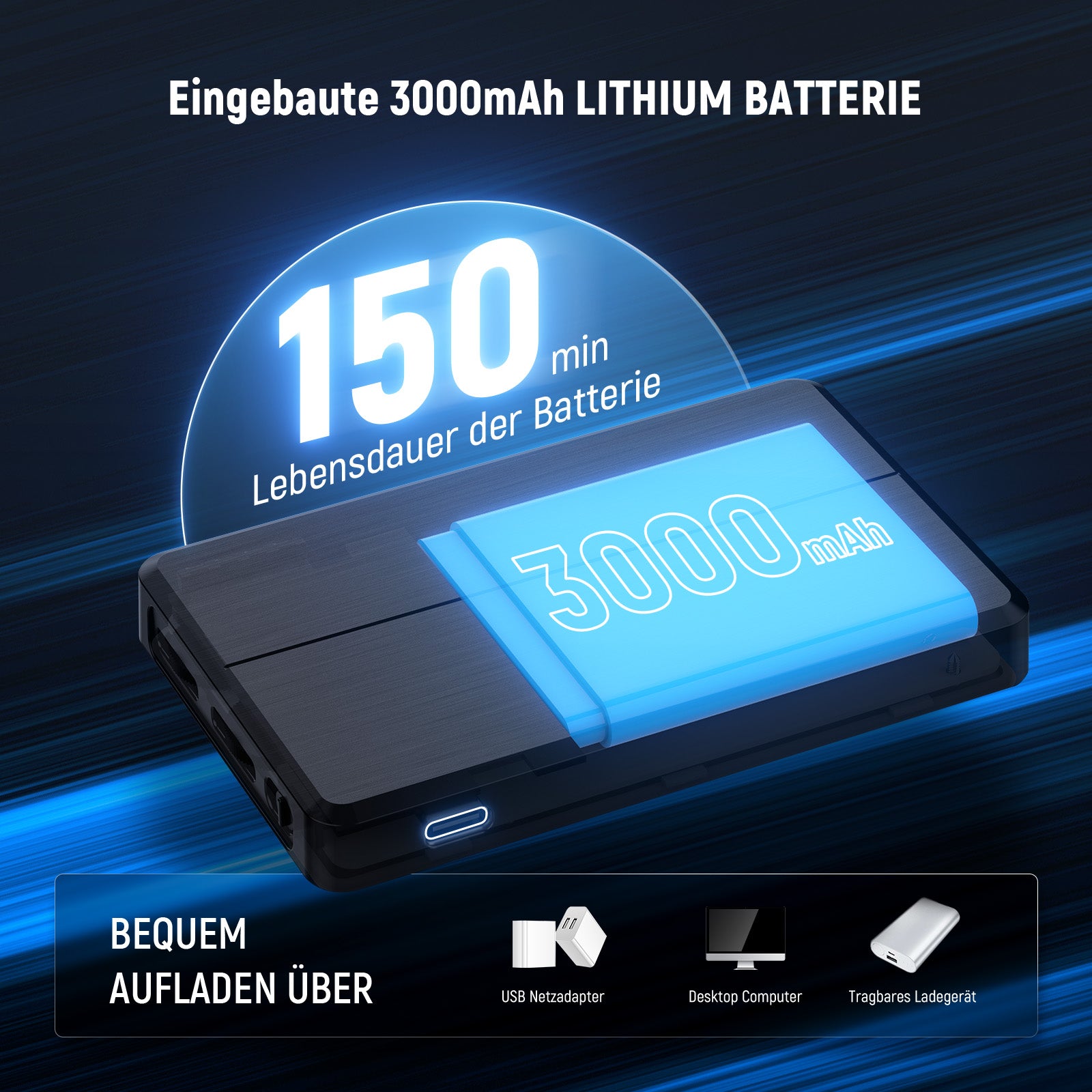- Eingebaute Batterie: 3000mAh Lithium-Batterie