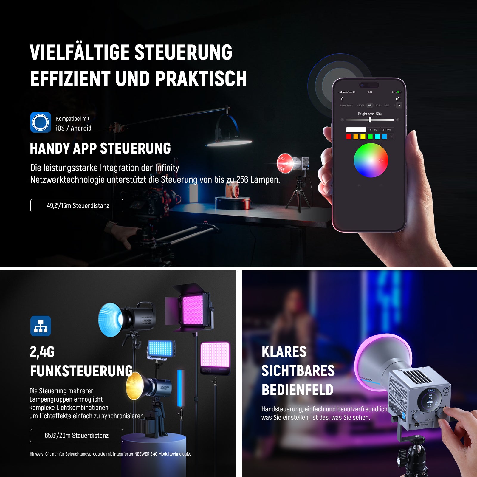 - APP/2,4G/Onboard Steuerung- Laden Sie die NEEWER APP herunter und verwenden Sie die Infinity Technologie, um bis zu 256 Lichter innerhalb von 15m zu steuern, die Einstellungen per Funk anzupassen und OTA Hardware Updates zu aktivieren. Das integrierte 2,4G System ermöglicht die Verwaltung von Lichtgruppen durch synchronisierte Steuerung mehrerer NEEWER Fülllichter innerhalb von 20m. Oder bedienen Sie die grundlegenden Funktionen/Einstellungen einfach mit den physischen Tasten am Lichtkörper
