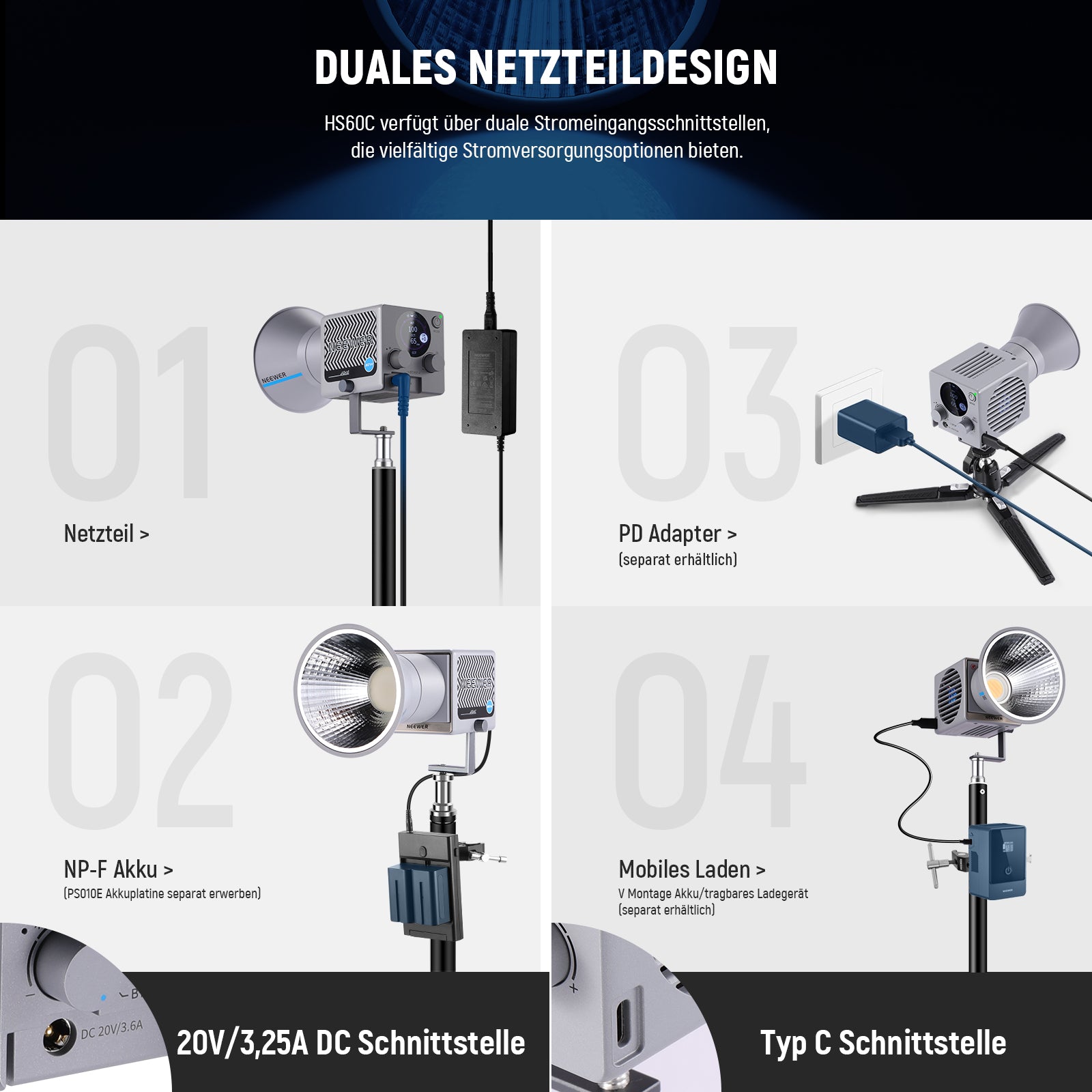 60W RGB Studiolicht- Die HS60C video studio light verwendet hochwertige COB LEDs, hell und flackerfrei. Erzeugt bis zu 8.700Lux/1m (5600K) bei Verwendung der Mischkammer und des Reflektors, bietet 2700K-6500K mit GM±50 für eine präzise Farbtemperaturkontrolle. Der CRI 97+ gewährleistet eine hohe Farbgenauigkeit, 0-100% Dimmung und 36.000 volle RGB Farben, ermöglicht durch RGBWW Mischtechnologie. Inklusive CCT/HSI/XY/RGBCW/FX Modi, 18 Spezialszenen und 4 Dimmkurven für professionelle Anwendungen