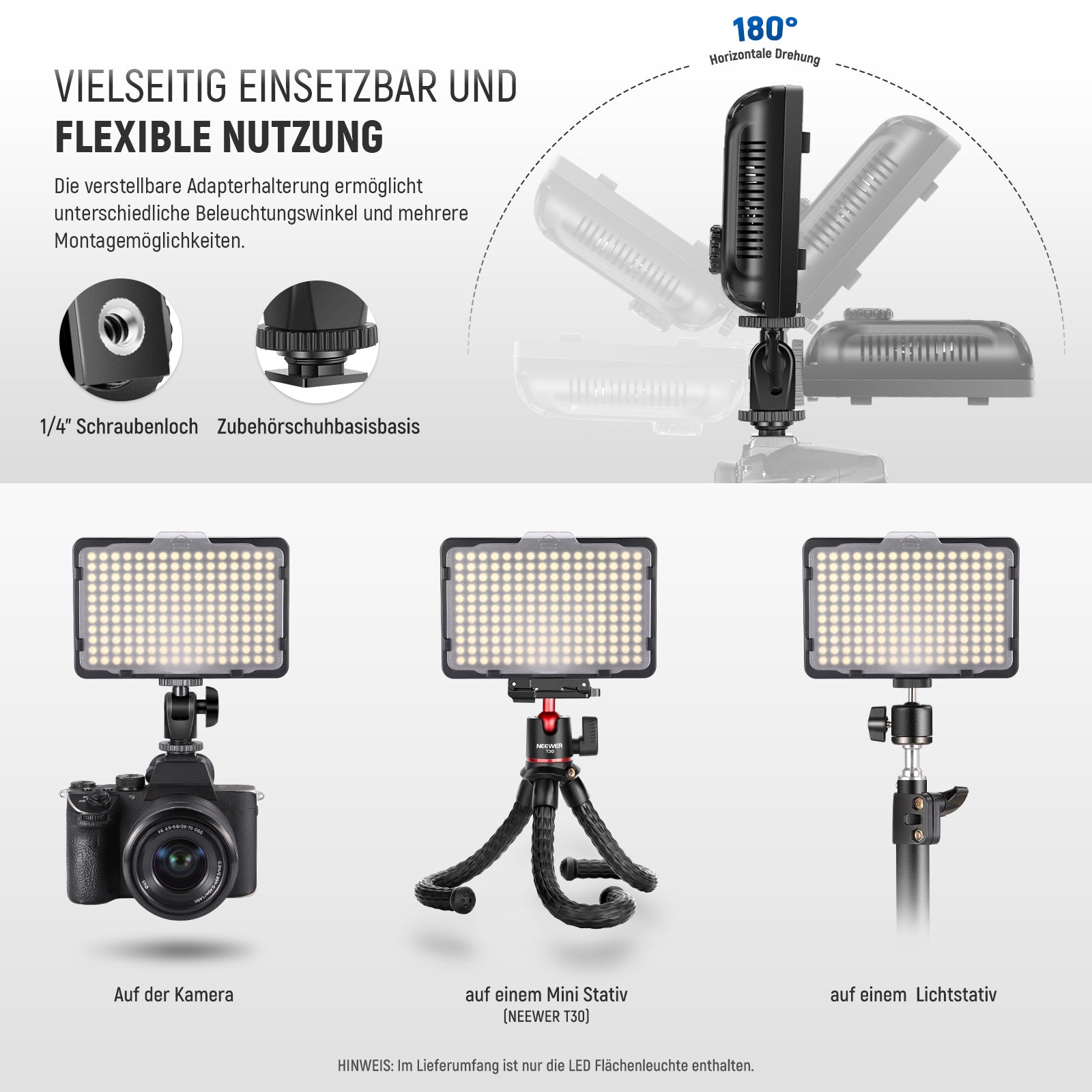 Notiz: Stativ, Kamera und Akku sind nicht im Lieferumfang enthalten.
