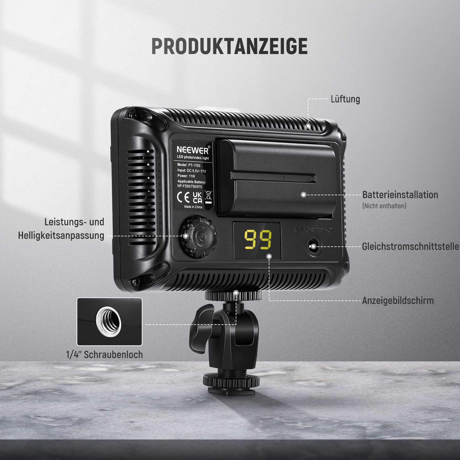 • Hinweis: Netzteil, Kabel und Batterie sind nicht im Lieferumfang enthalten; 176 ultrahelle LED-Leuchtmittel: Mit 176 einzelnen langlebigen LED-Leuchtmitteln bietet diese Leuchte eine breitere Leuchtweite und beleuchtet eine kontinuierliche Tageslichtausgleich bei 5600 K