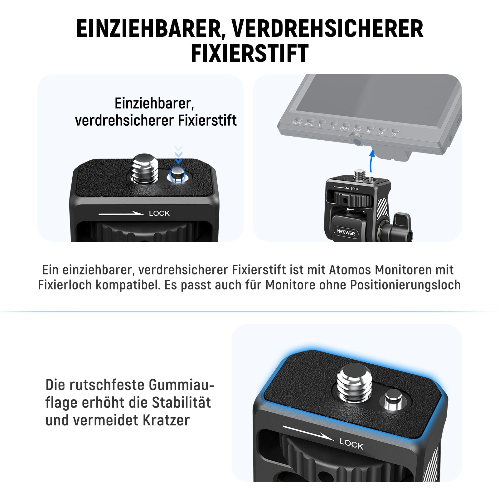 - Retractable Anti Twist Locating Pin- A retractable anti twist locating pin is compatible with Atomos Ninja V Ninja V+ and other monitors with a locating hole, or NEEWER F100 F200 F400 Pro F500 monitors without a locating hole. The nonslip rubber pad adds stability and prevents scratches