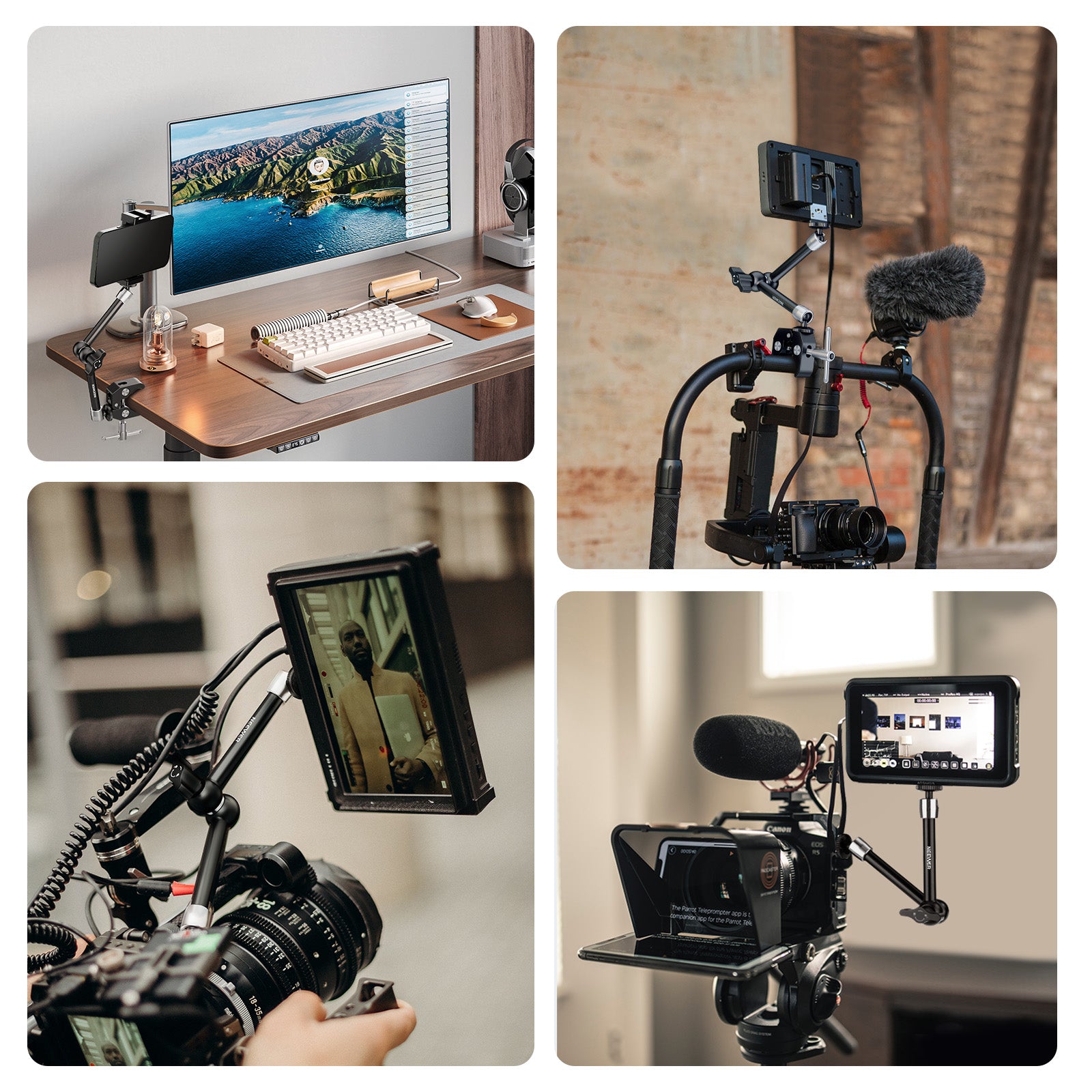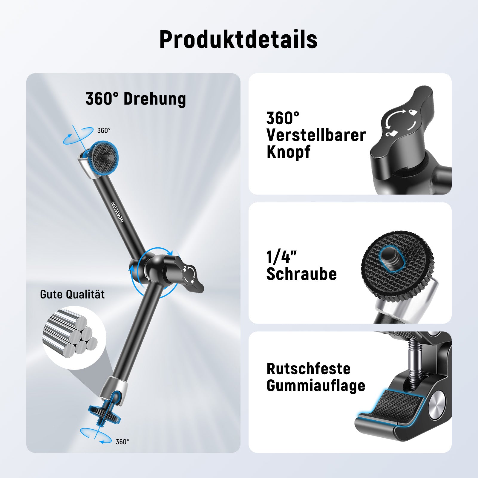 • Einstellbare Aufnahmewinkel- Zwei 360°Kugelköpfe können je nach Bedarf jeden Winkel für eine Vielzahl von Aufnahmepositionen bieten. Verriegeln Sie den Magischen Arm fest, indem Sie den Verriegelungsknopf drehen