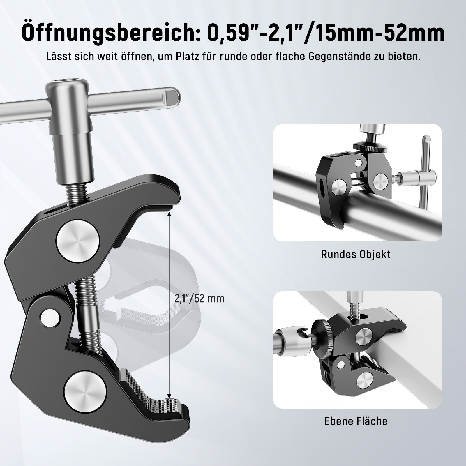 3. Super Clamp funktioniert mit 0.59-2.1inches/15-52mm Durchmesser Stange.