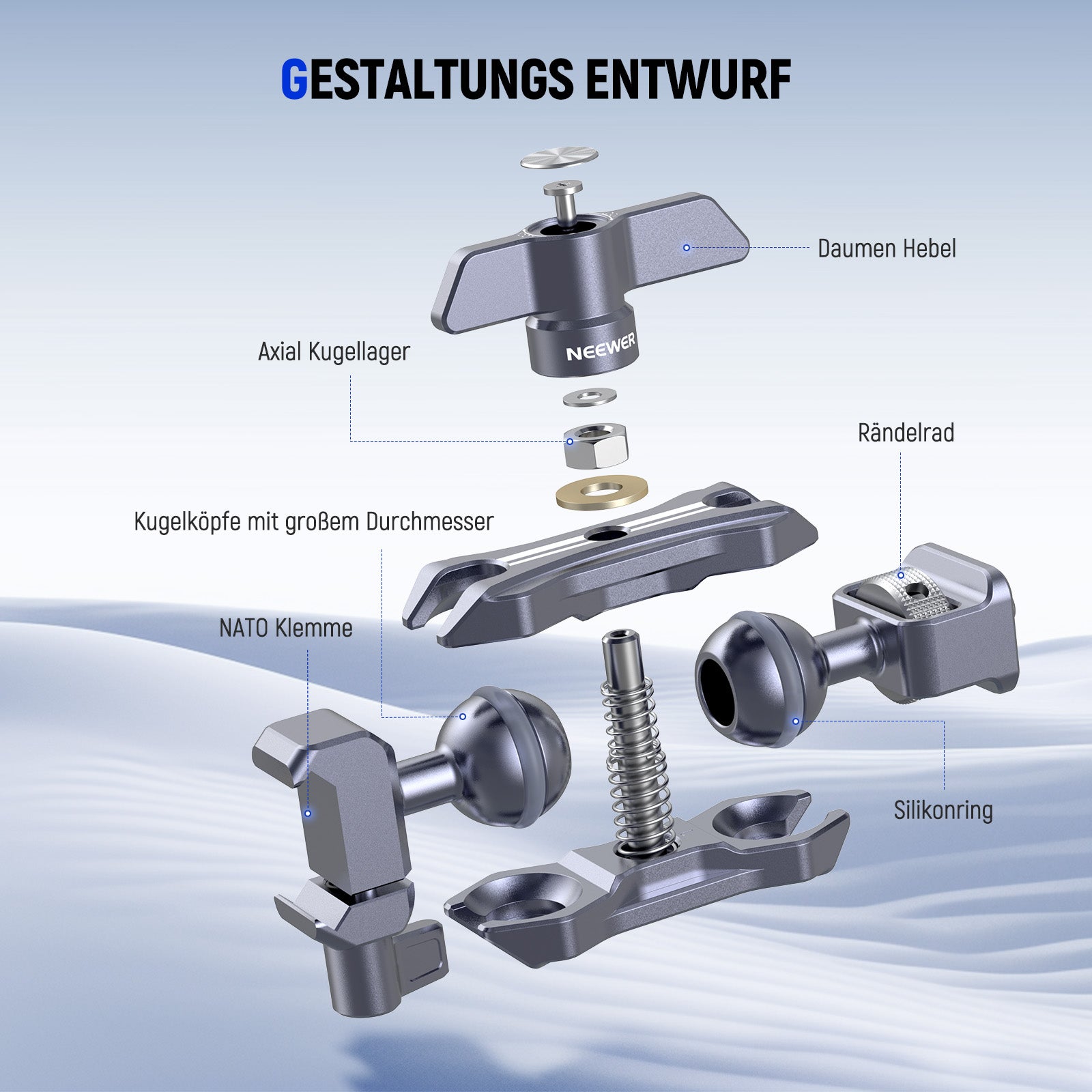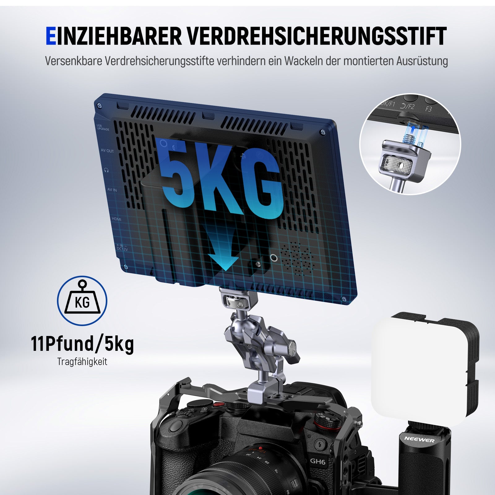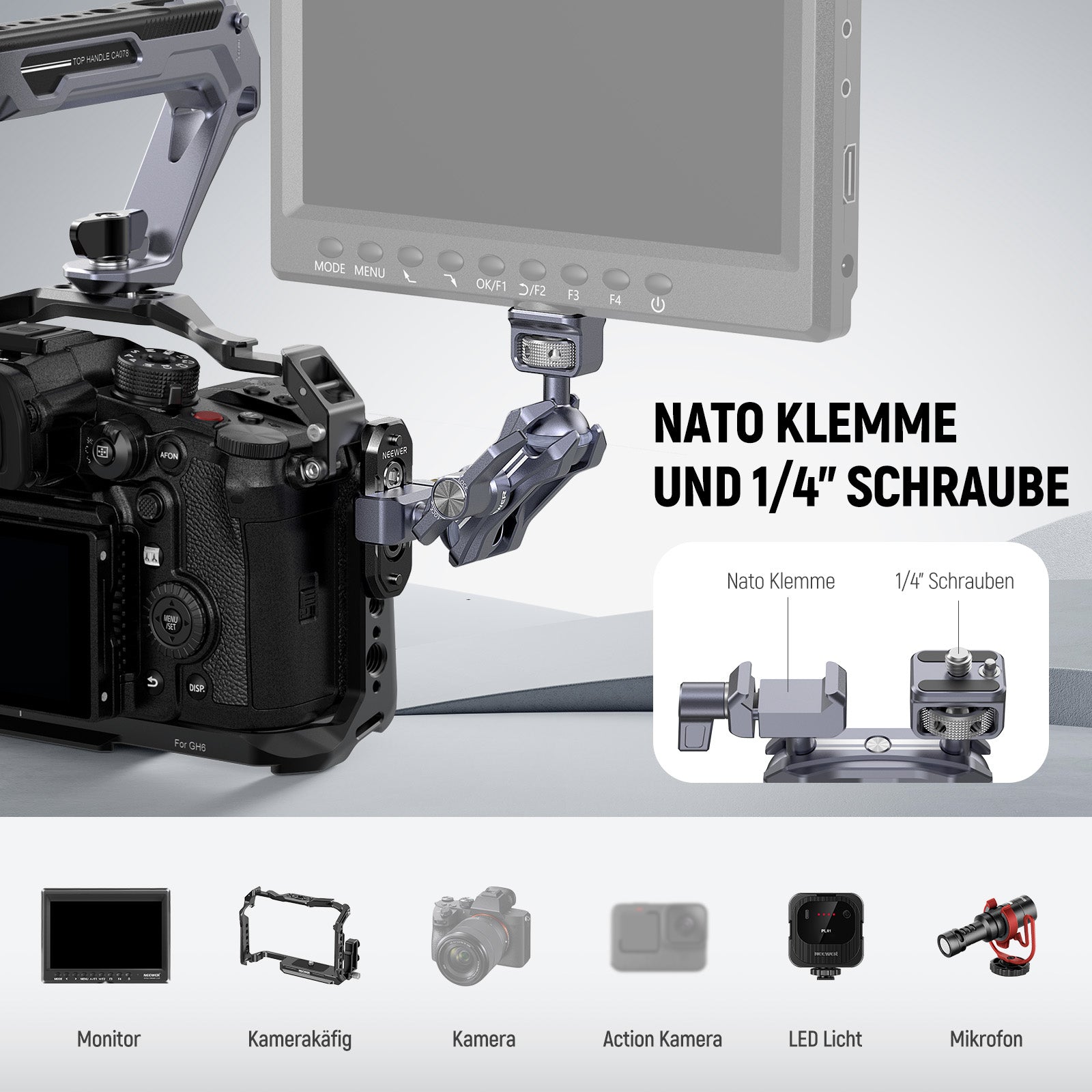 - NATO Klammer und 1/4" Schraube- Eine NATO Klemme kann schnell an einen Kamerakäfig angeschlossen werden (kompatibel mit SmallRig und NEEWER), während eine 1/4" Schraube eine Reihe von Geräten mit einem Gewicht von bis zu 11Pfund/5kg befestigen kann, einschließlich Feldmonitoren. LED Videoleuchten, Mikrofone und Action Kameras