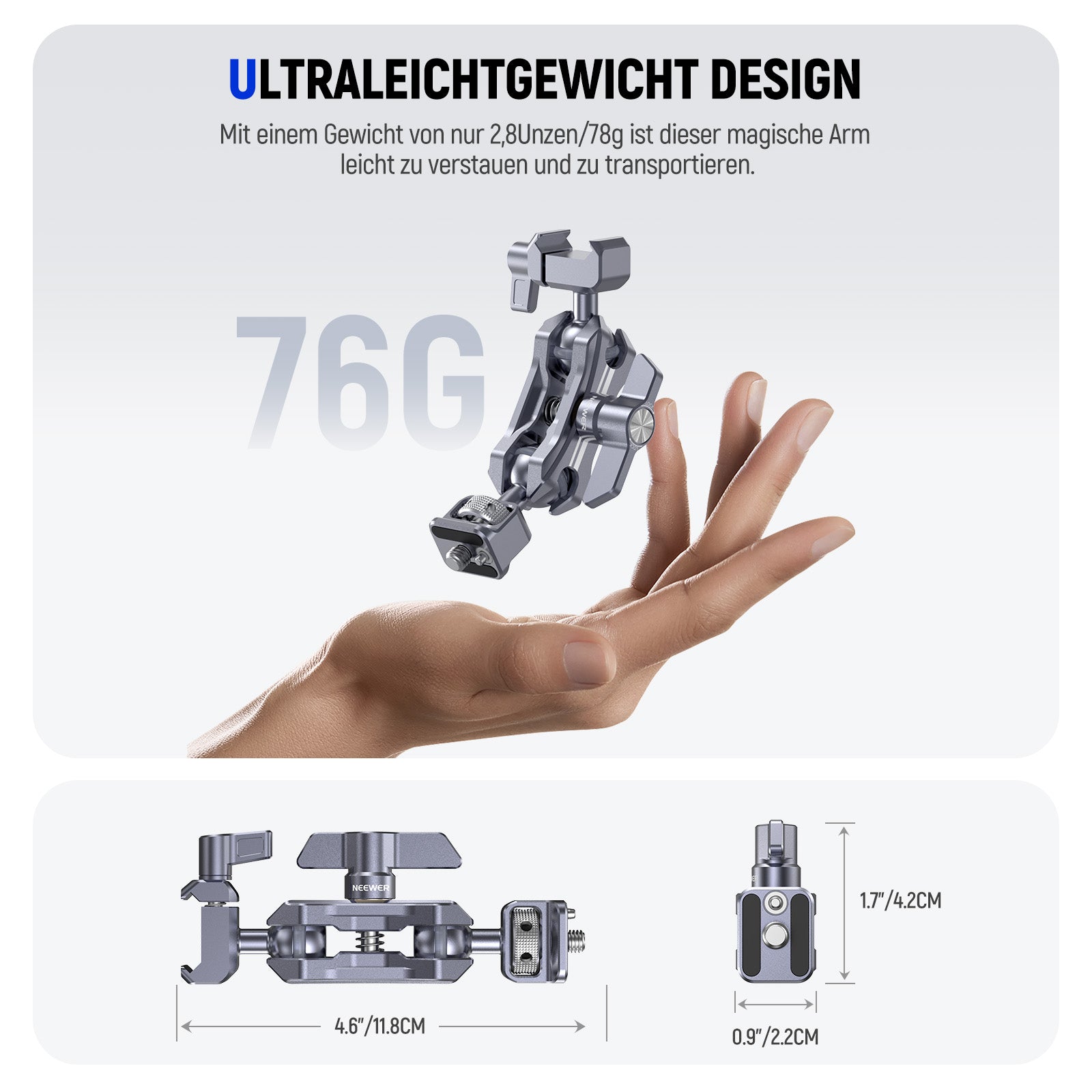 - Ultraleichtes Design- Mit seinem geringeren Gewicht ((2,7Unzen/76g)) ist dieser magische Arm ideal für Outdoor Fotografie, Filmaufnahmen, Vlogging und Live Streaming geeignet. Mit seinen Maßen von 4,6"x1,7"x0,9"/118x42x22mm ist er tragbar und lässt sich leicht in der Tasche verstauen