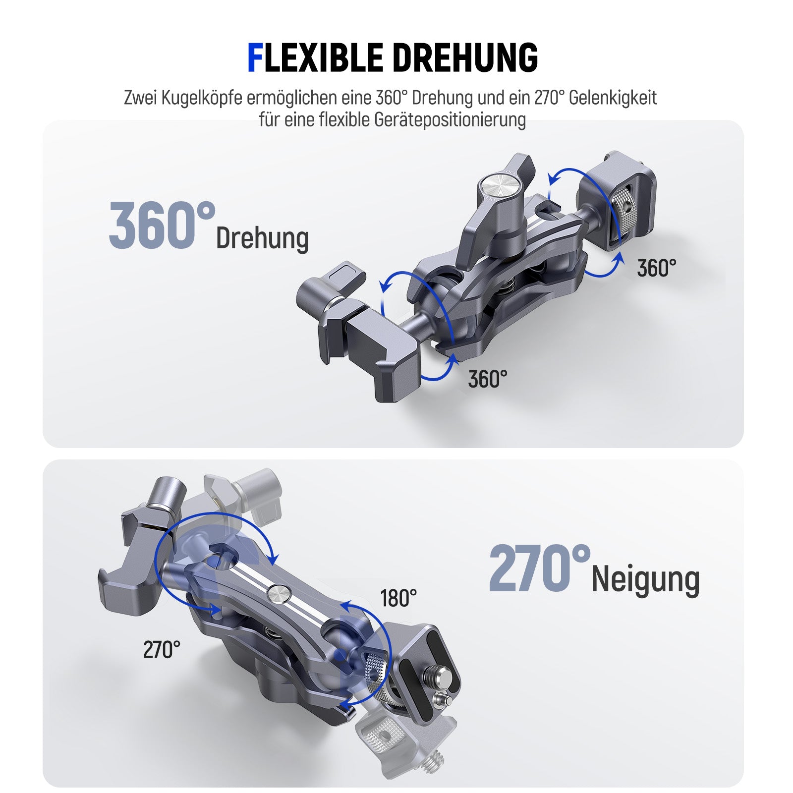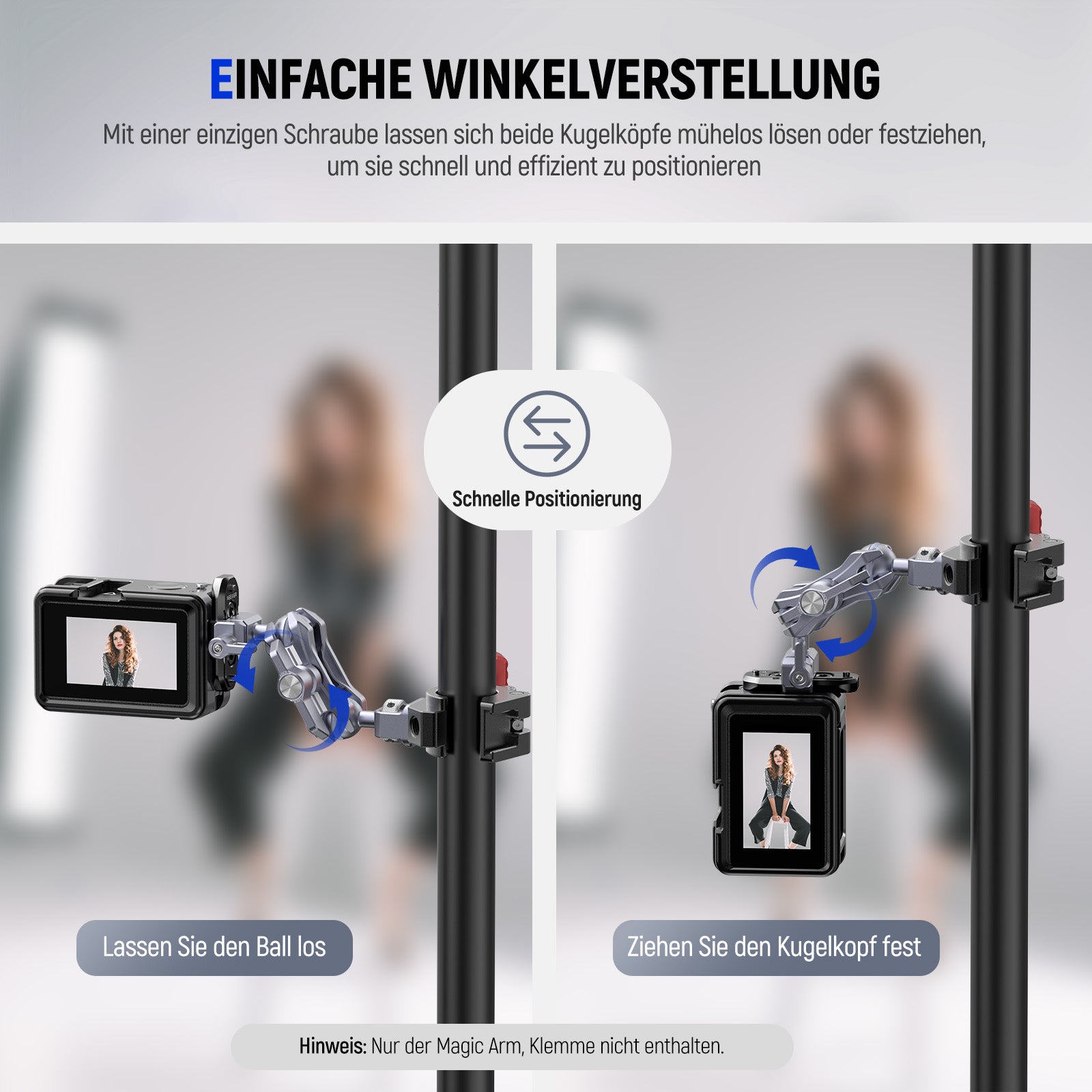 - 360° Drehung und 270° Neigung- Diese Reibung Arm Kamerahalterung mit zwei Kugelköpfen ermöglicht eine 360° Drehung und 270° Neigung für eine flexible Positionierung. Gummiringe erhöhen die Reibung und sorgen für zusätzliche Sicherheit