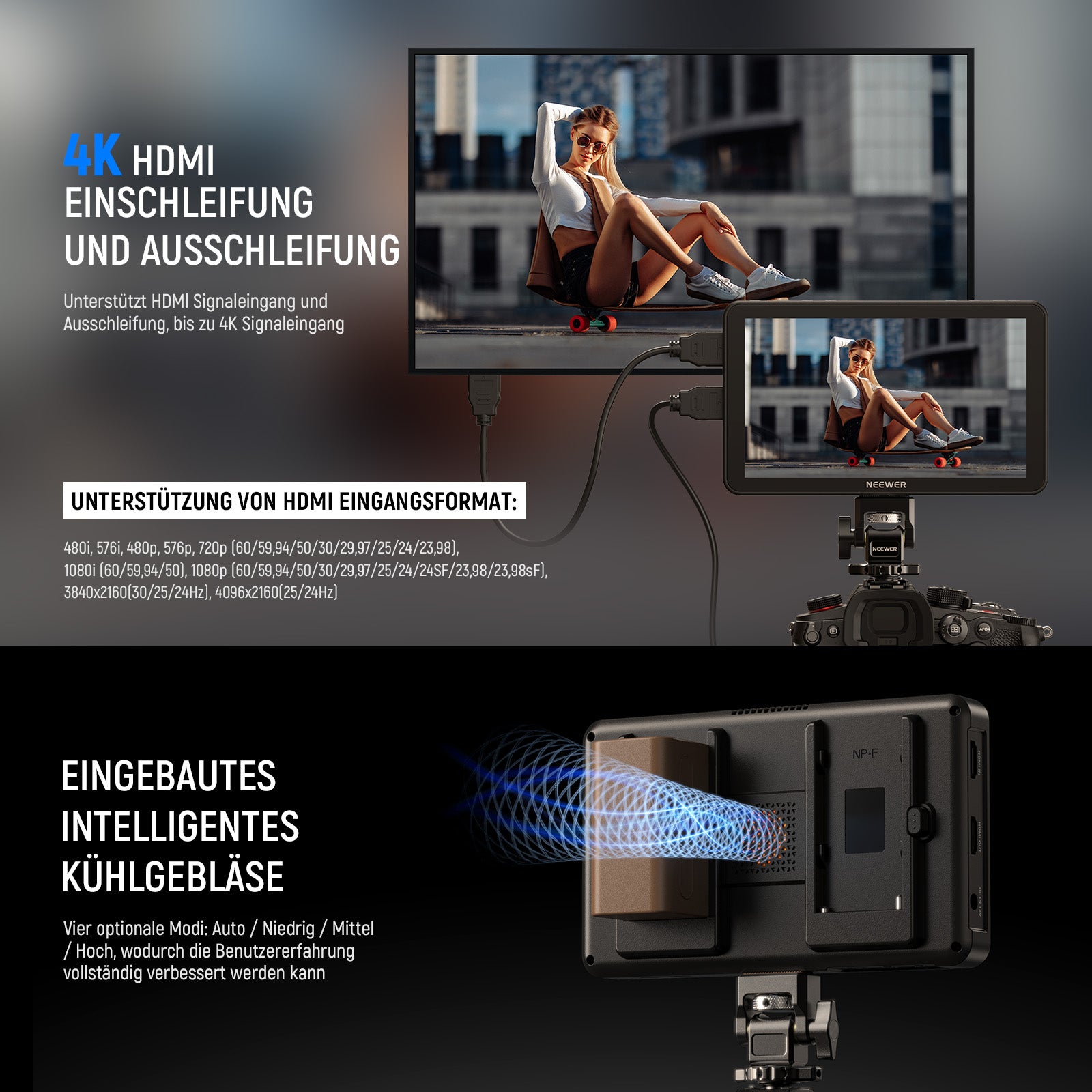 - 180° verstellbar und verbesserte Kühlung- Ausgestattet mit 1/4" Schraubenlöchern an der Unterseite und an der Seite, bietet der DSLR Monitor flexible Befestigungsmöglichkeiten und verfügt über eine Cold Shoe Halterung für eine 180° Einstellung. Darüber hinaus leiten die eingebauten Lüfter die Wärme effizient ab, sodass Sie sie auch bei längerem Gebrauch verwenden können. Der Monitor funktioniert auch als Dummy Batterie für die Kamera über einen DC 8V/1,5A Ausgang für längere Außenaufnahmen