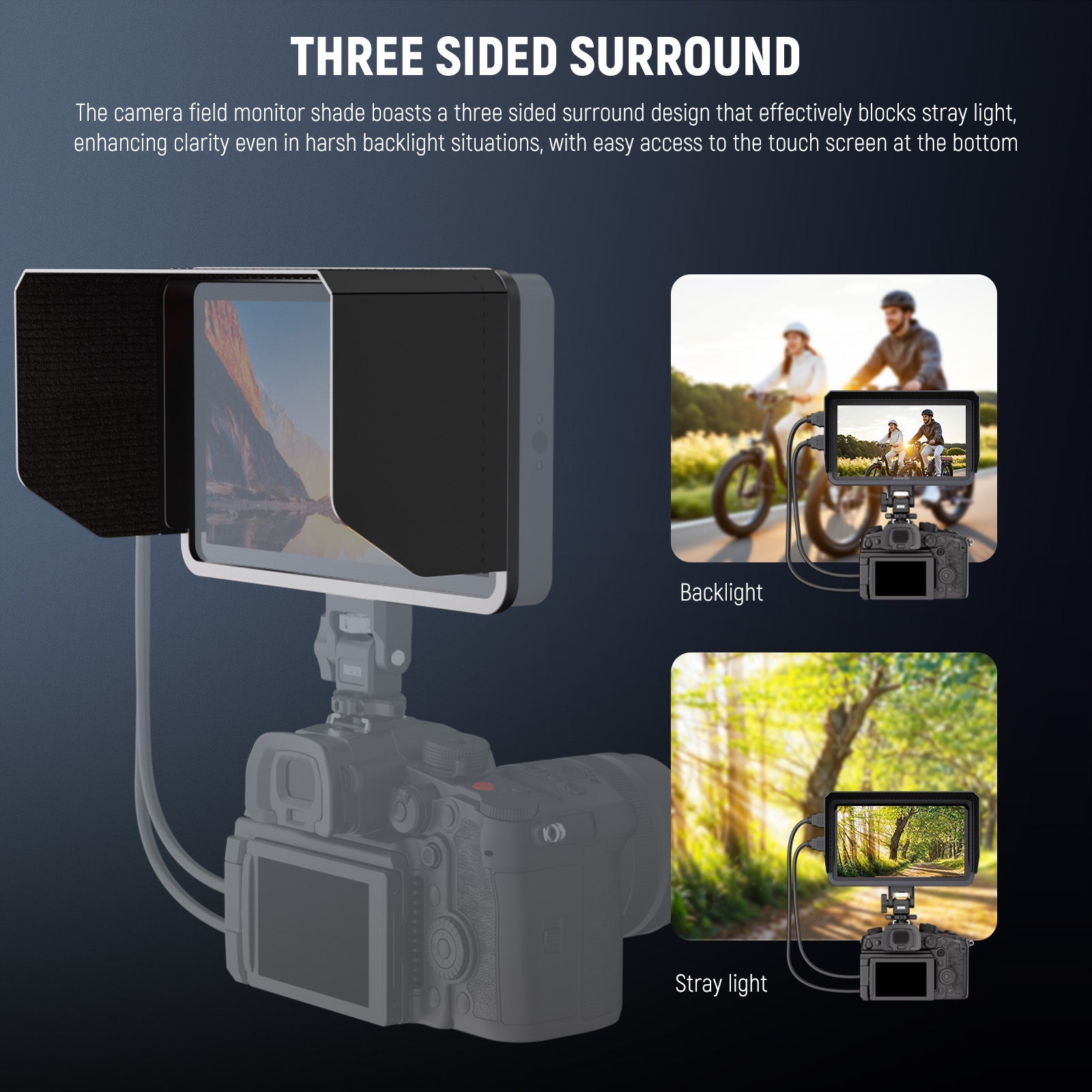 - Dreiseitige Umrandung- Die Abdeckhaube des Kamera Feldmonitors hat ein dreiseitiges Umrandung Design, das Streulicht effektiv blockiert und die Klarheit auch bei schlechten Lichtverhältnissen verbessert, und der Touchscreen an der Unterseite bietet einfachen Zugriff auf die