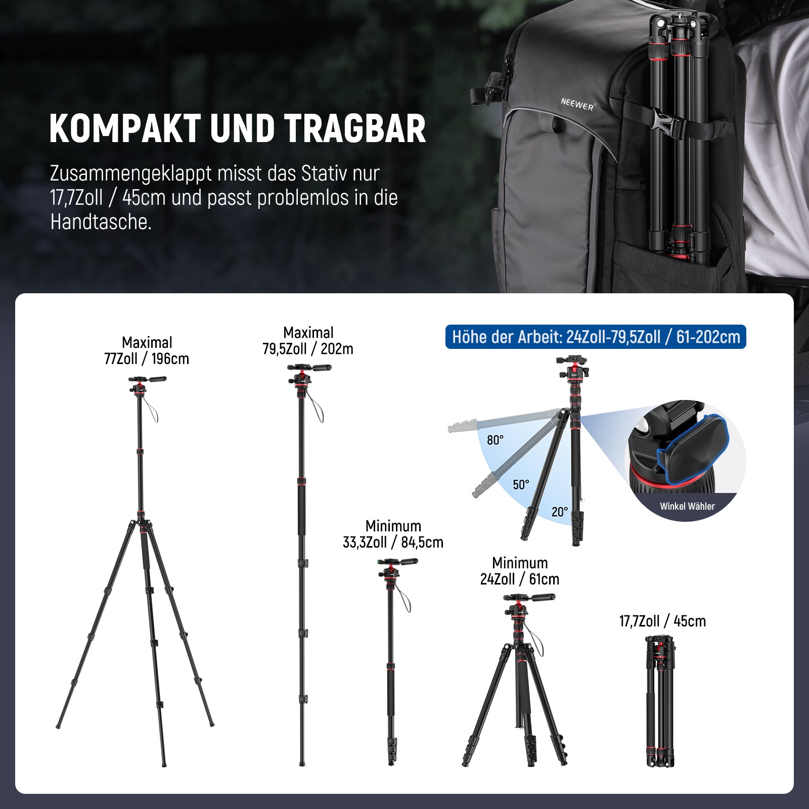 Umkehrbare Beine und mobile Nutzung- Dieses tragbare Stativ wiegt nur 3,4Pfund / 1,6kg und verfügt über umkehrbare Beine, die sich um 180° nach oben klappen und auf einen kompakten Durchmesser von 4,5" / 11,5cm zusammenklappen lassen, um die Lagerung und den Transport zu erleichtern, ideal für Reise Vlogging, Selfies, Fotografie, YouTube Videos und Live Streaming im Innen und Außenbereich