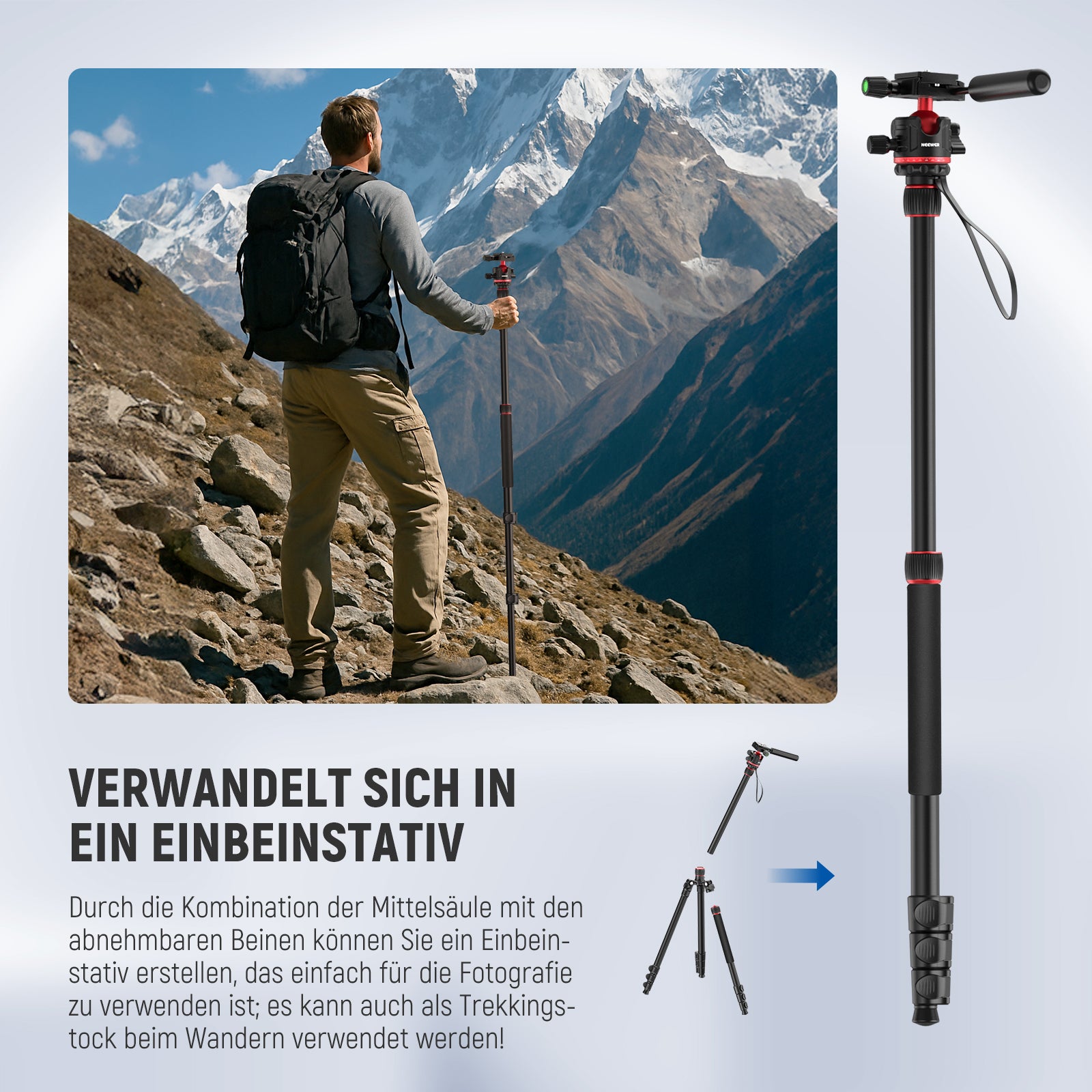 - 2 in 1 Fotostativ und Einbeinstativ- Einfacher Wechsel vom Dreibein Stativ zum Einbeinstativ! Nehmen Sie einfach ein Bein vom Tripod ab und befestigen Sie es an der Mittelsäule. Das ist ideal für professionelle und stabile Kameraaufnahmen, Langzeitbelichtungsfotos mit dem Stativ und schnelle, bewegte Situationen mit dem Einbeinstativ. Außerdem kann das Einbeinstativ bei Ihren Wanderungen auch als Trekkingstock verwendet werden